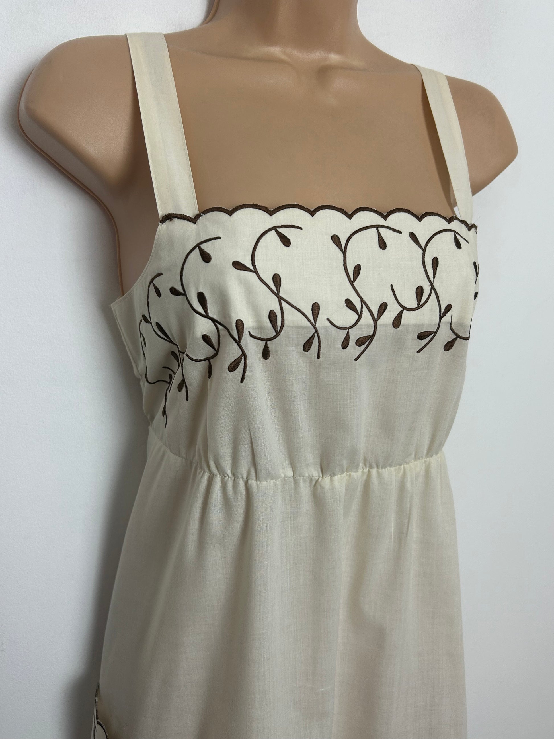 This pretty vintage sundress is made from a cotton fabric in cream. With brown embroidered detailing.