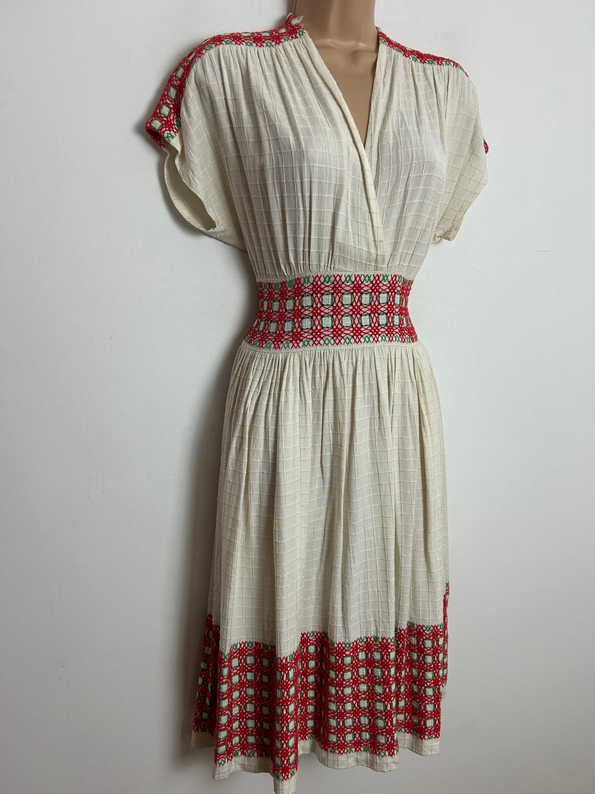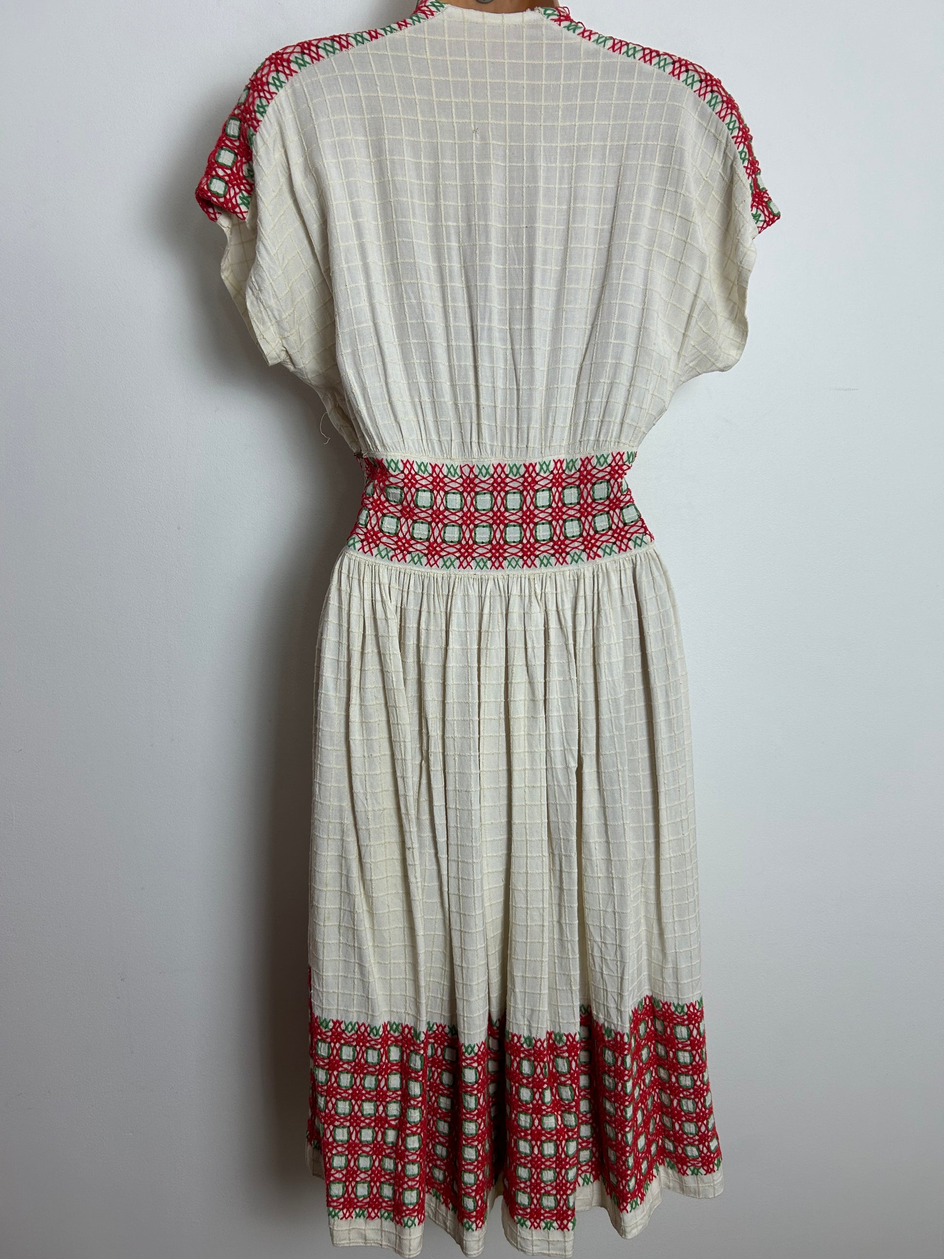Vintage 1940s Size 6 Cute Cream Waffle Textured Red & Green Wool Embroidered Cotton Day Dress