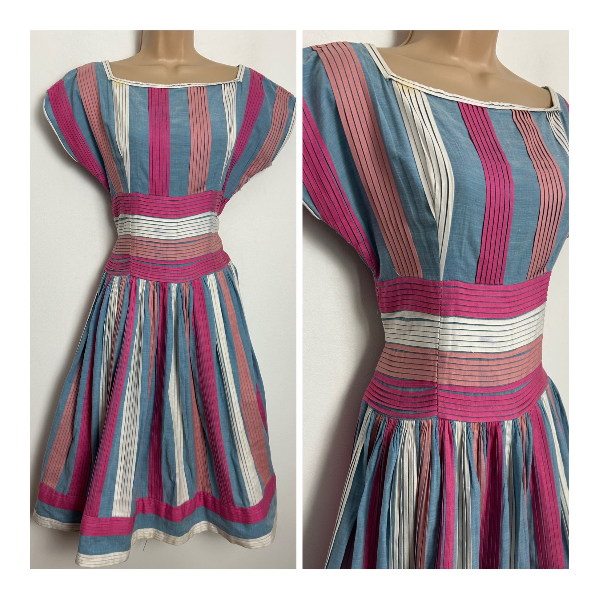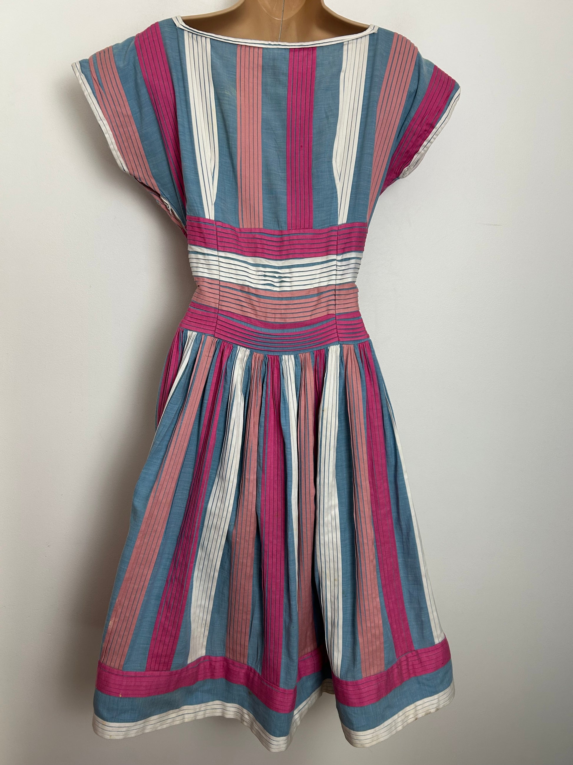 This lovely vintage pleated summer prom dress is made from a cotton fabric in blue pink & white.
