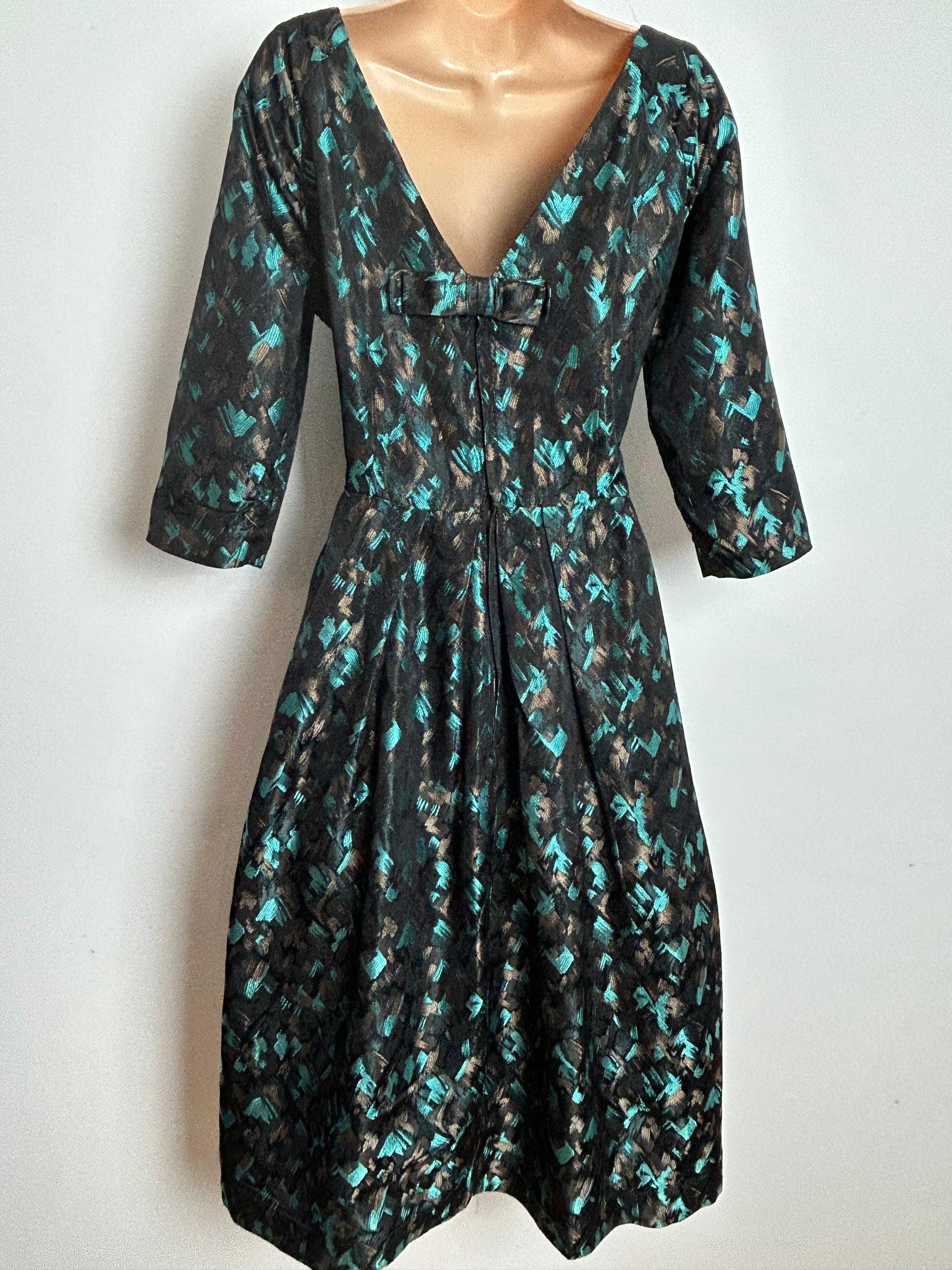 Vintage Late 1950s KITTY COPELAND Size 12-14 Black Blue & Bronze Jacquard Bow Detail Party Occasion Dress