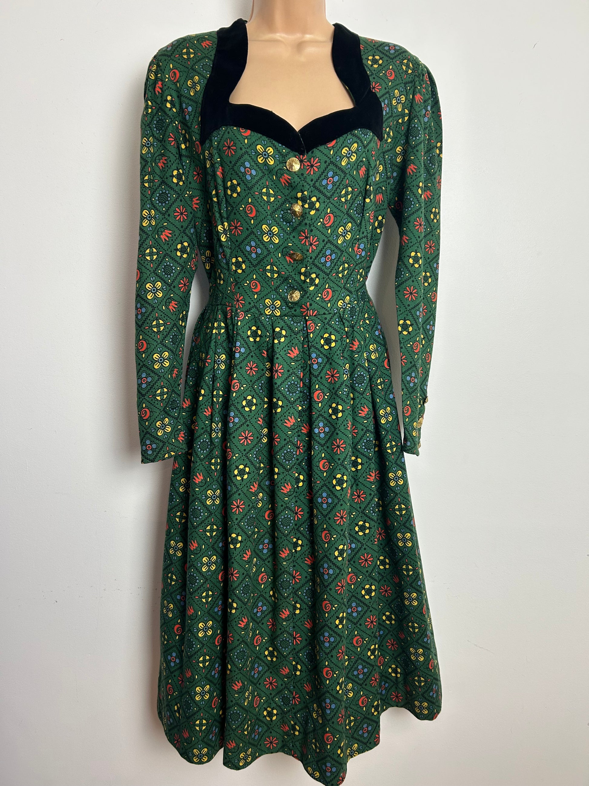 This lovely vintage day dress is homemade from a mid weight cotton fabric in dark green, red, yellow & blue abstract grid print.