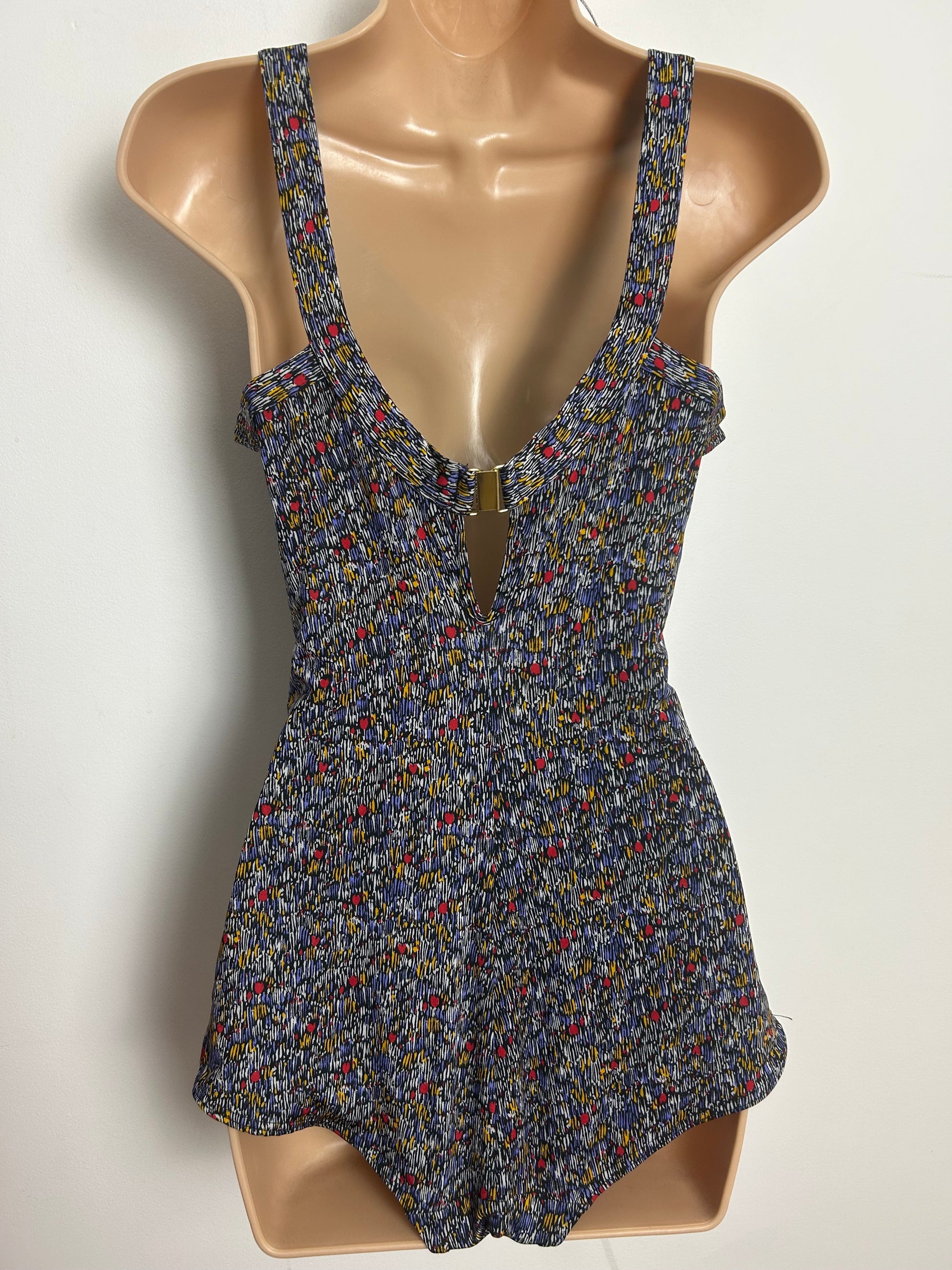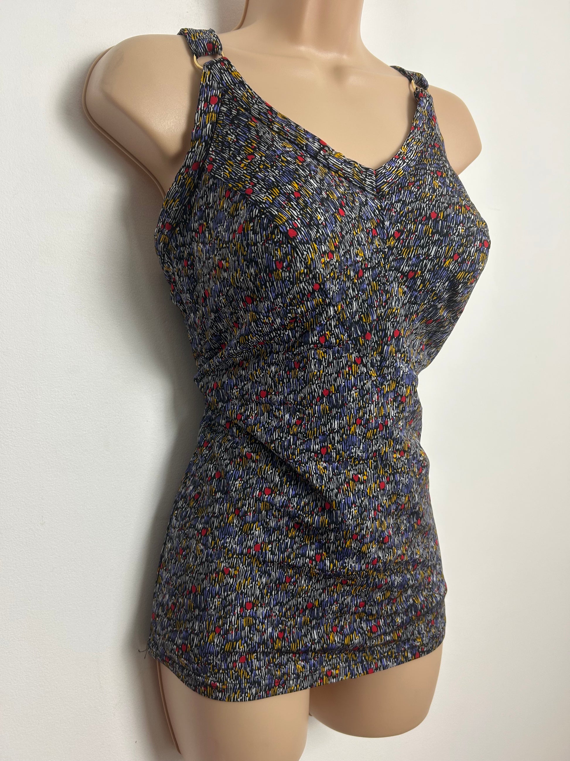 Vintage 1960s ANITA Size 14-16 Black Blue Red & Yellow Abstract Print Moulded Cup Skirted Swimsuit