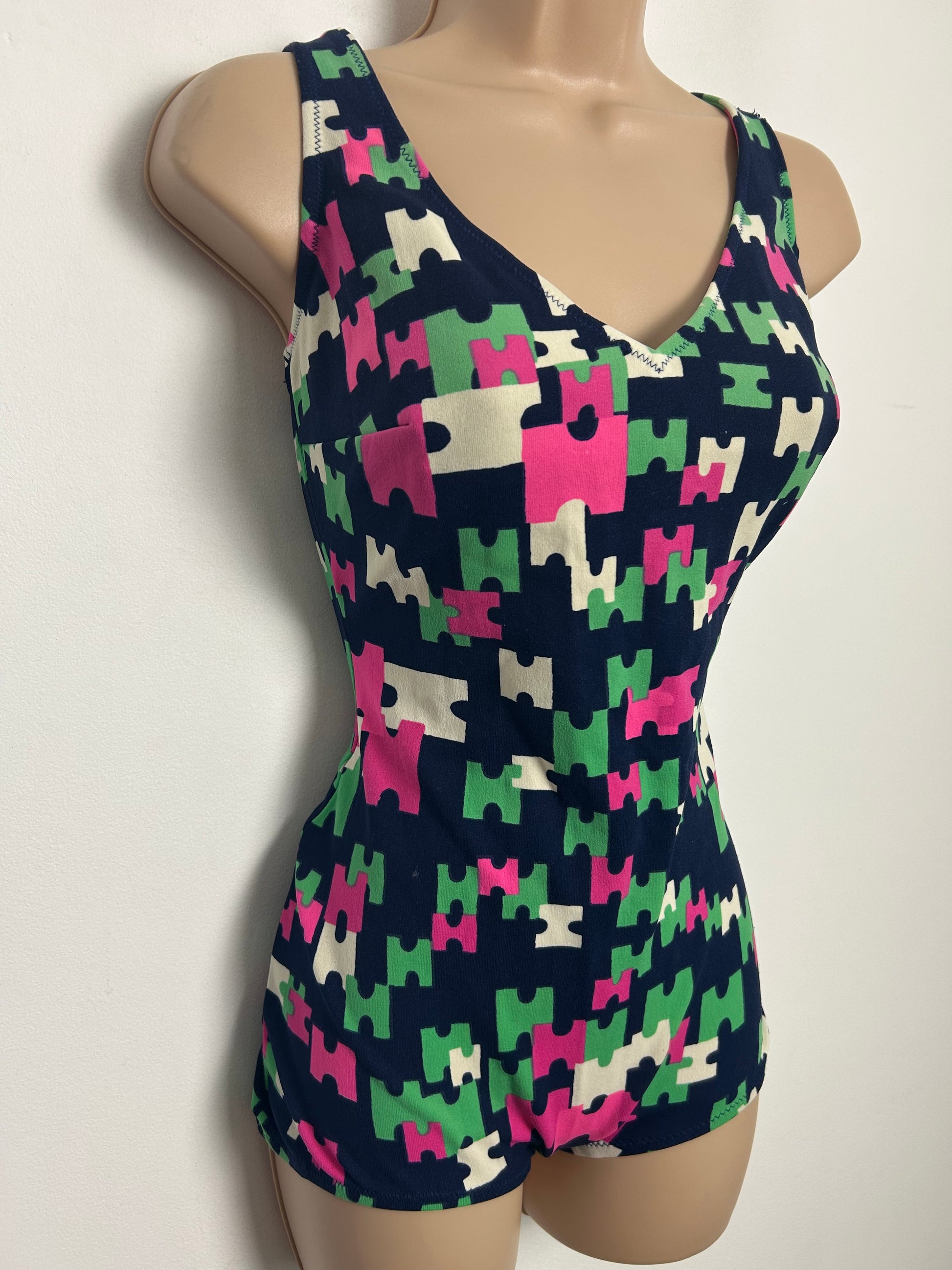 Vintage Late 1960s Approx Size 14-16 Navy Blue Pink Green & White Abstract Geo Jigsaw Style Print Swimsuit