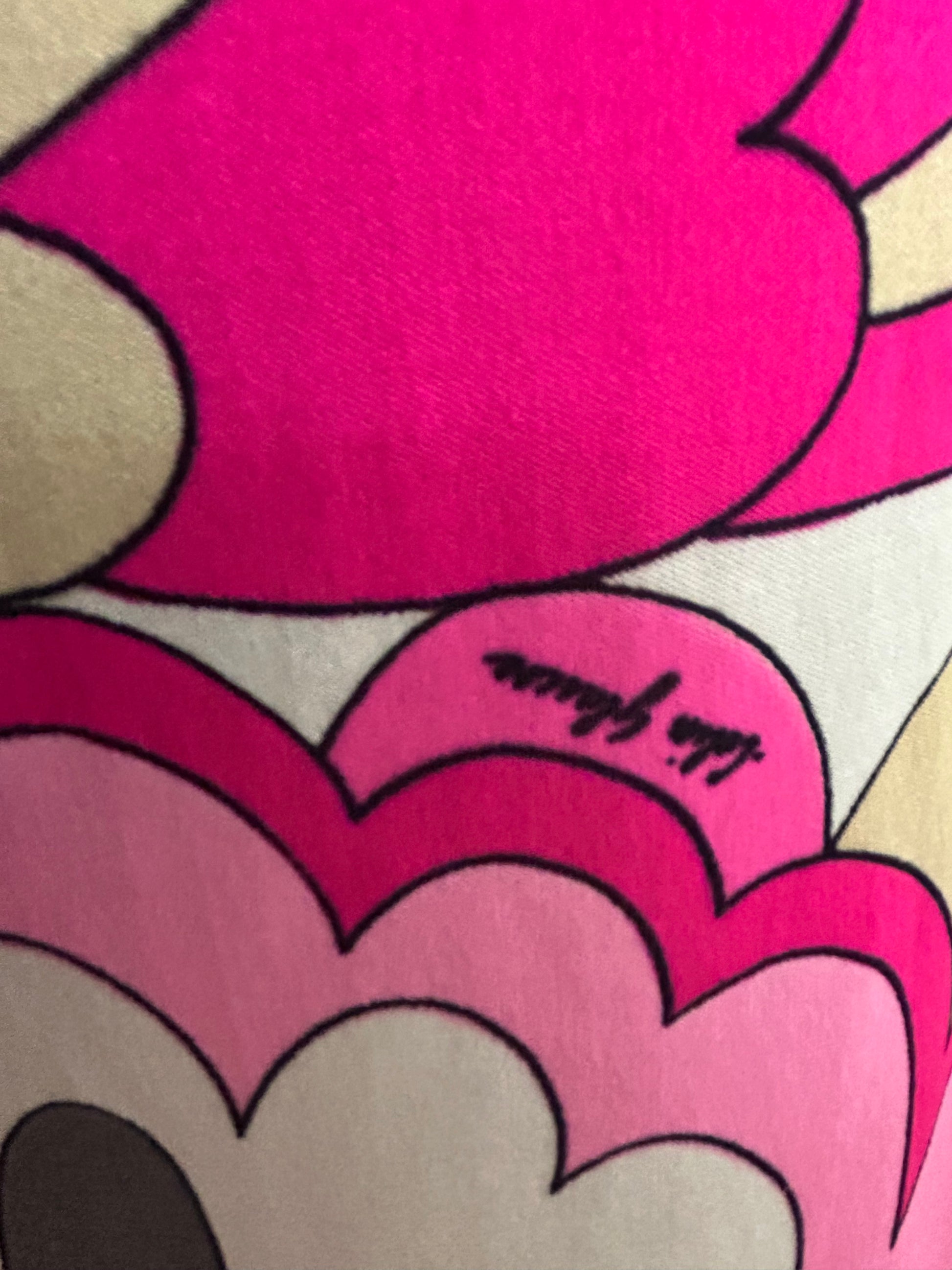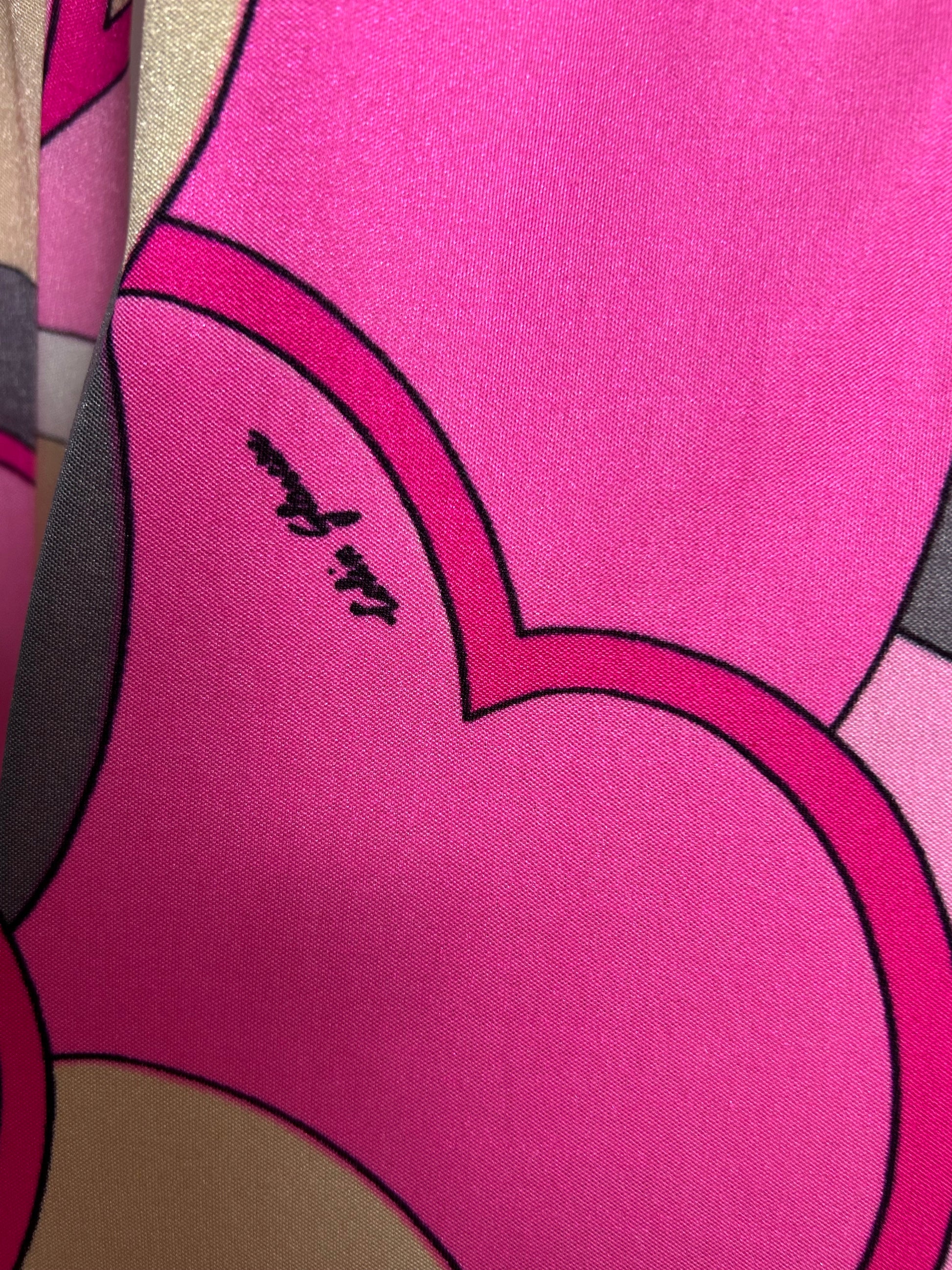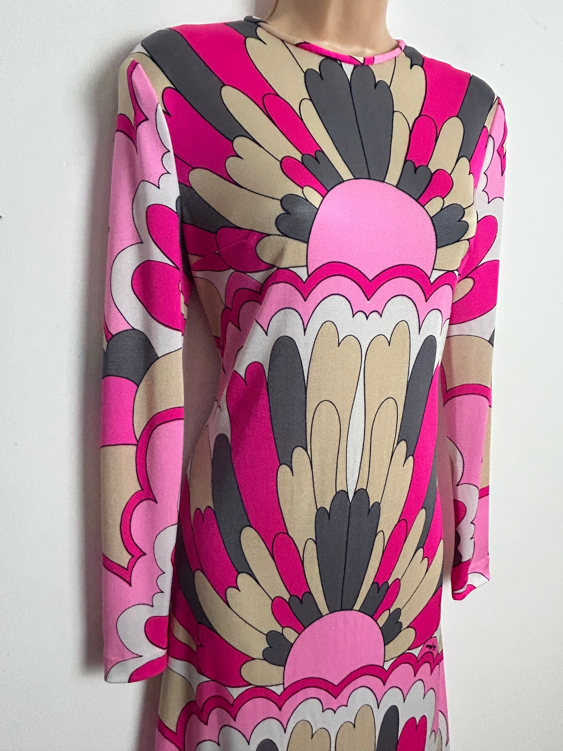 In pink beige grey & white psychedelic print. A very Pucci-esque print!