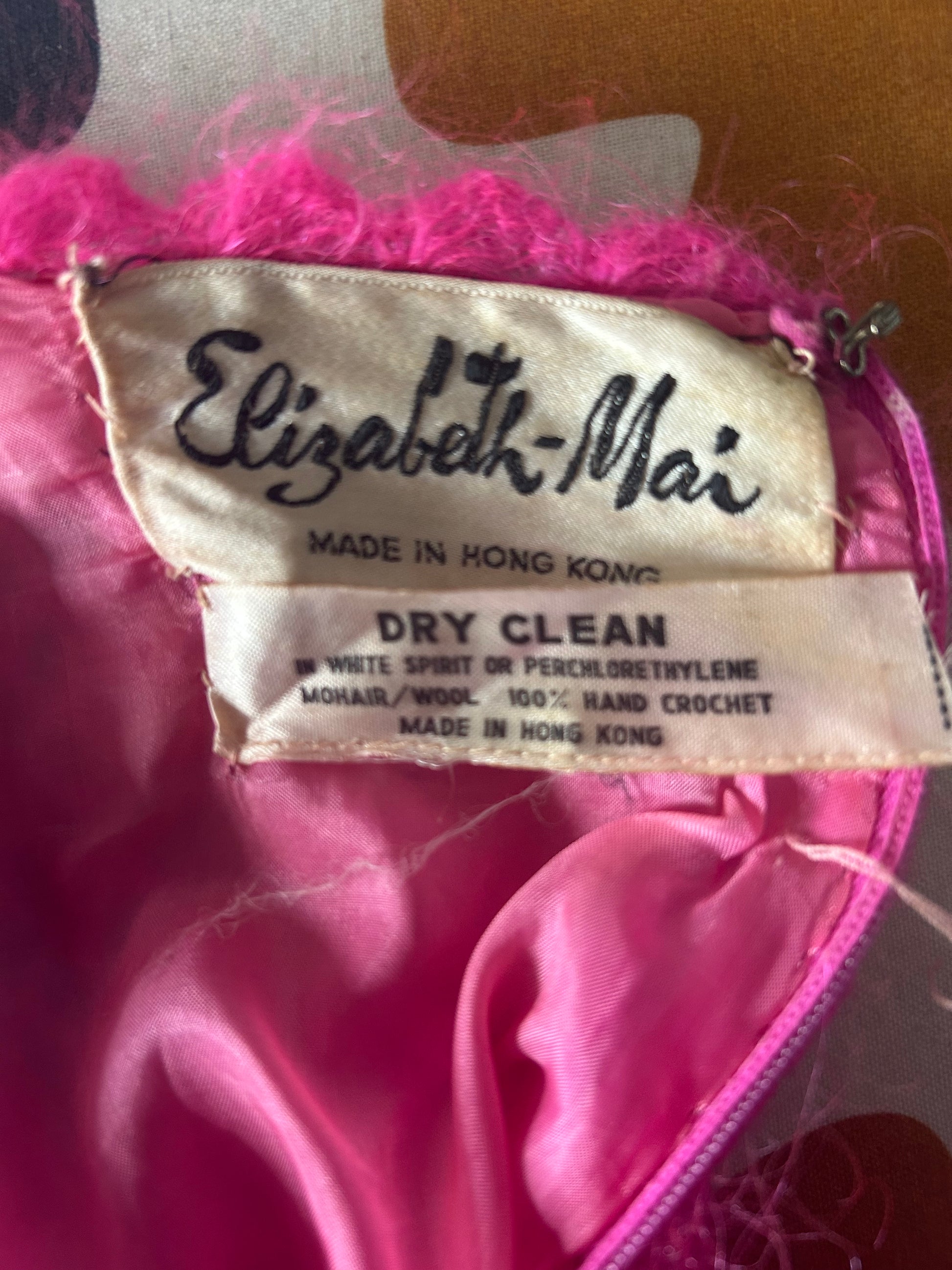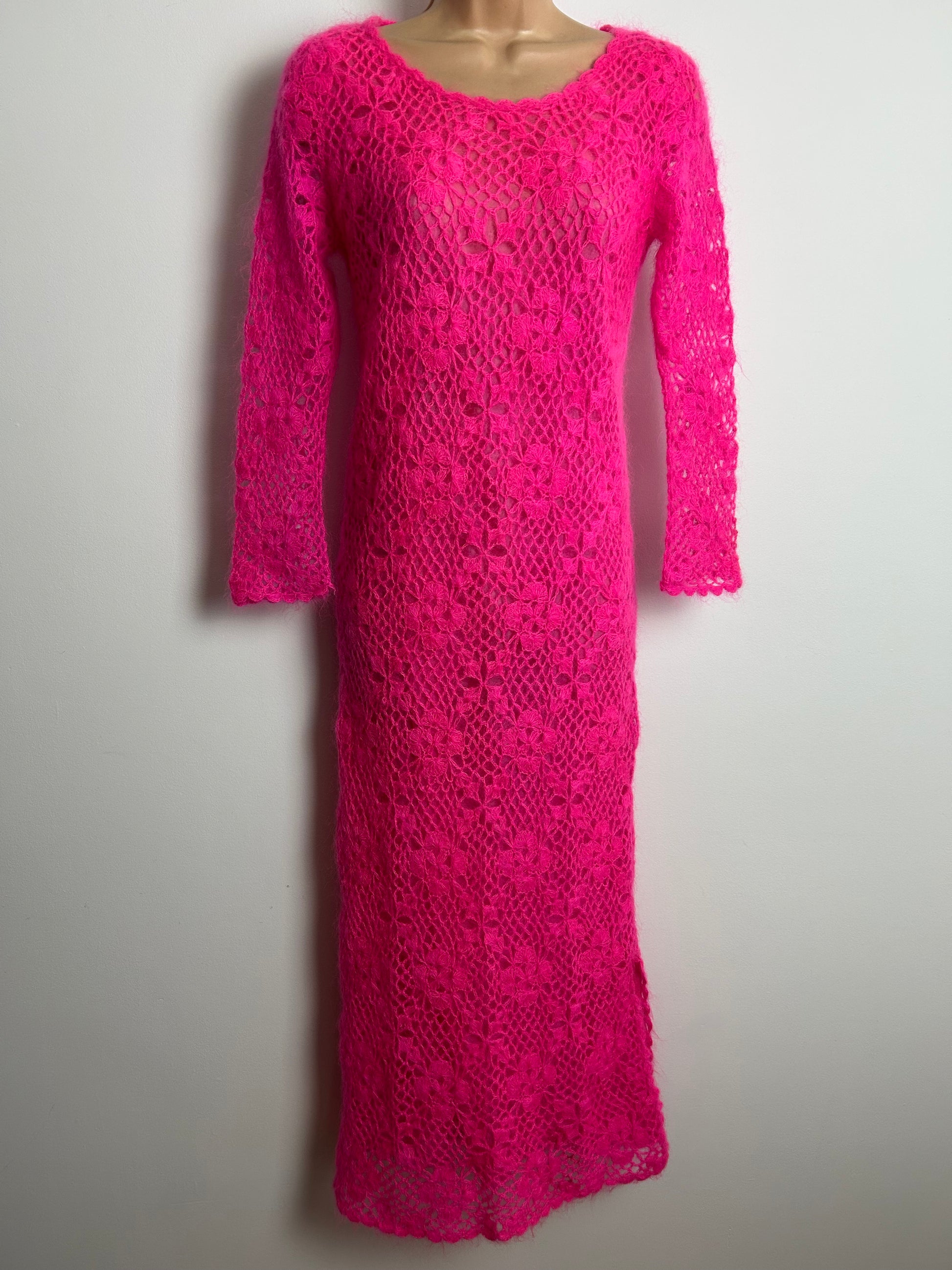 Vintage 1960s ELIZABETH MAI Made In Hong Kong Size 10-12 Beautiful Hand Crochet Hot Pink 100% Mohair Fully Lined Maxi Dress