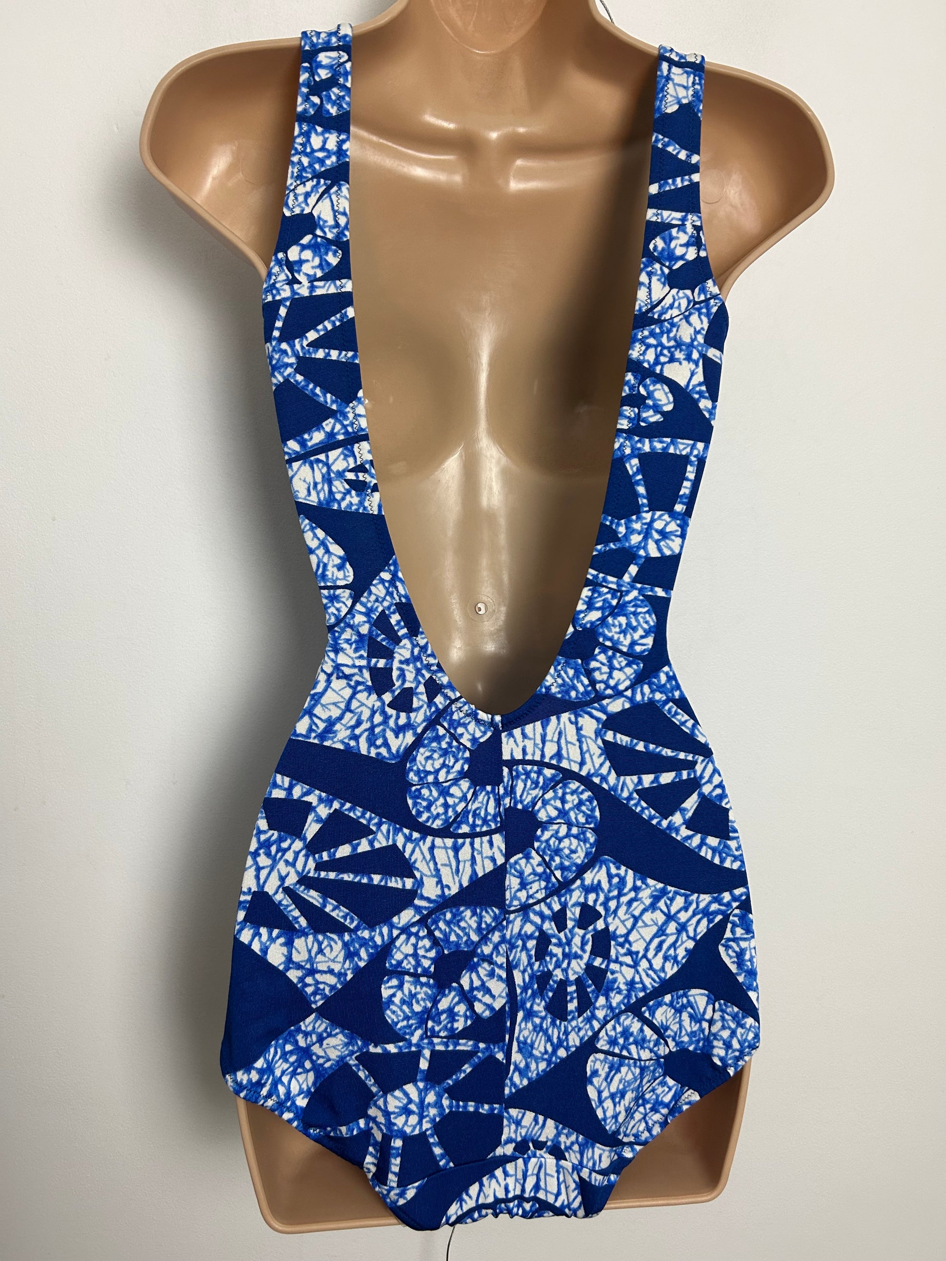 This lovely vintage swimsuit is a gorgeous blue & white abstract tie dye effect print.