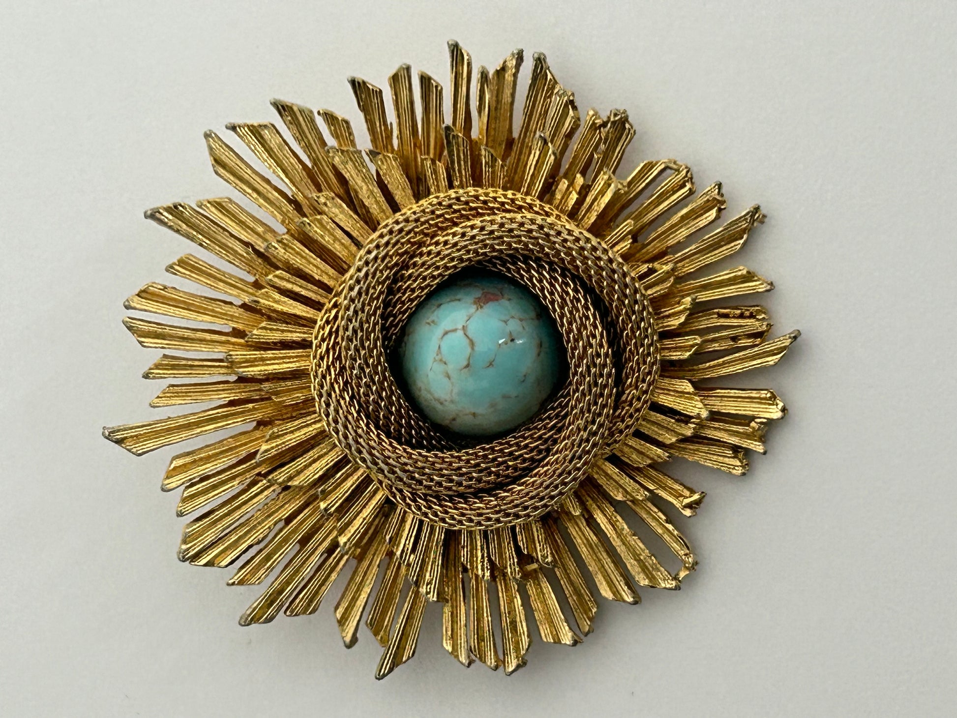 Vintage 1960s Gold Tone Base Metal Sunburst Turquoise Stone Set Brooch