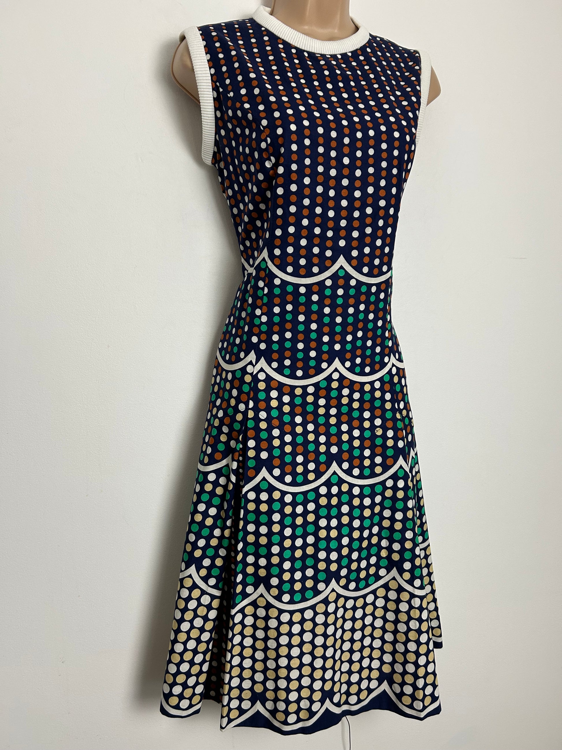 Vintage 1960s RODNEY Size 10 Navy Blue White Rust & Green Polka Dot Cotton Mix Kick Pleated Mod Dress