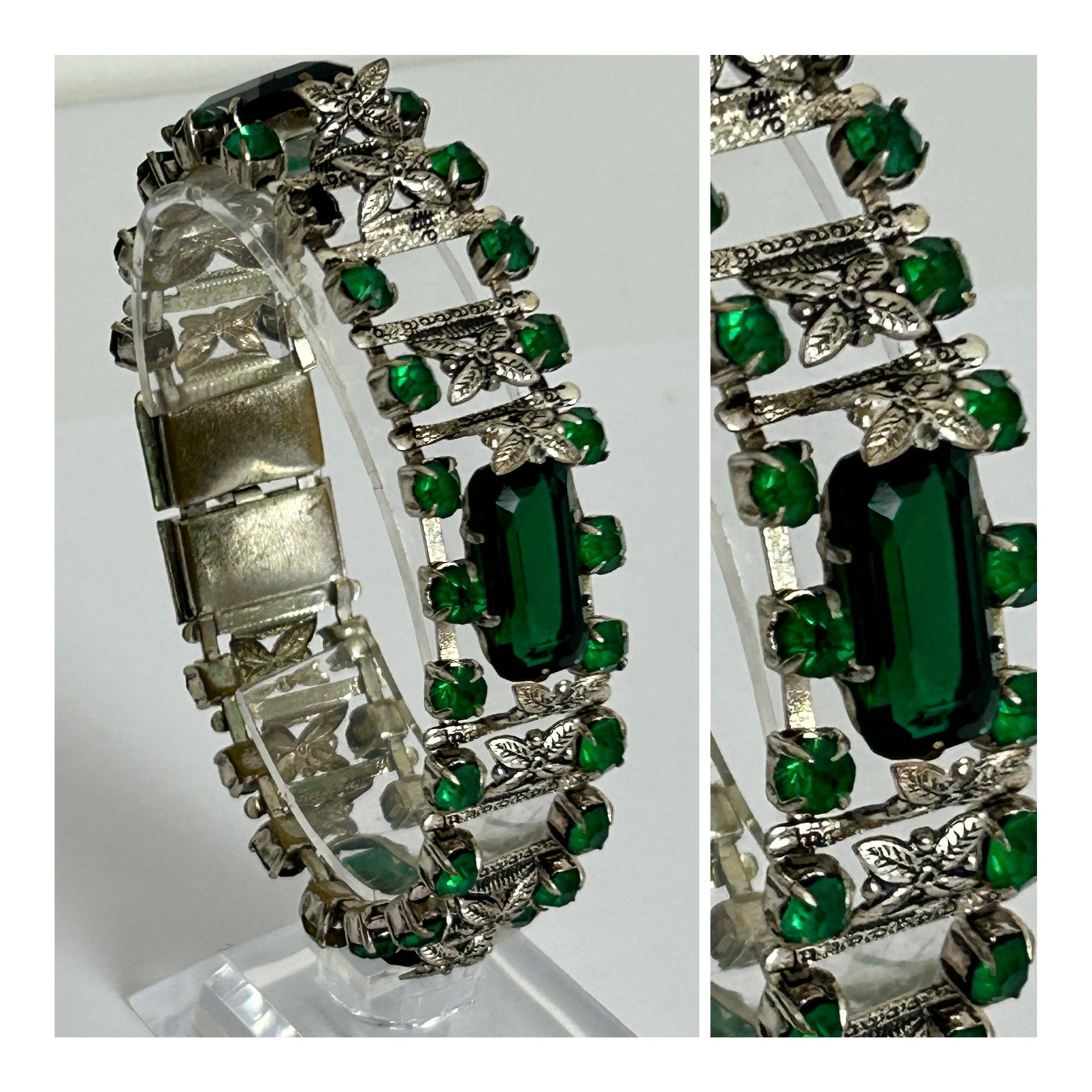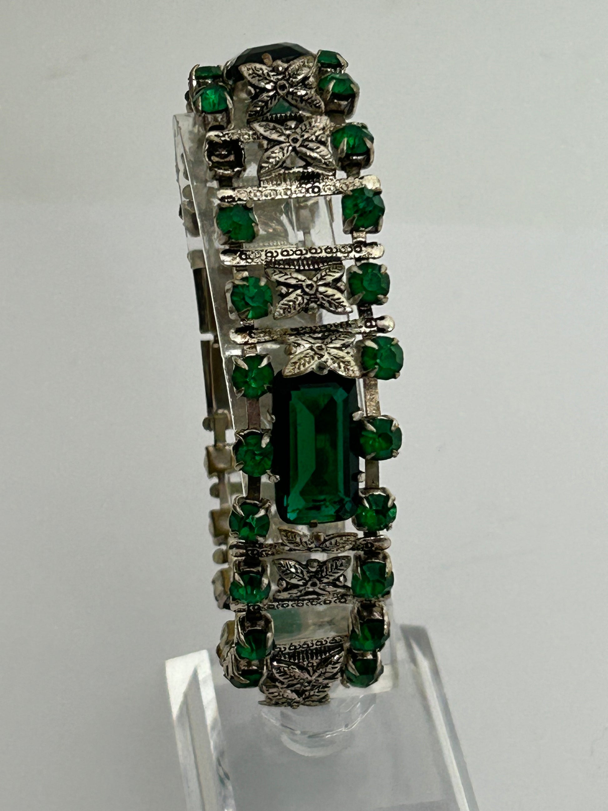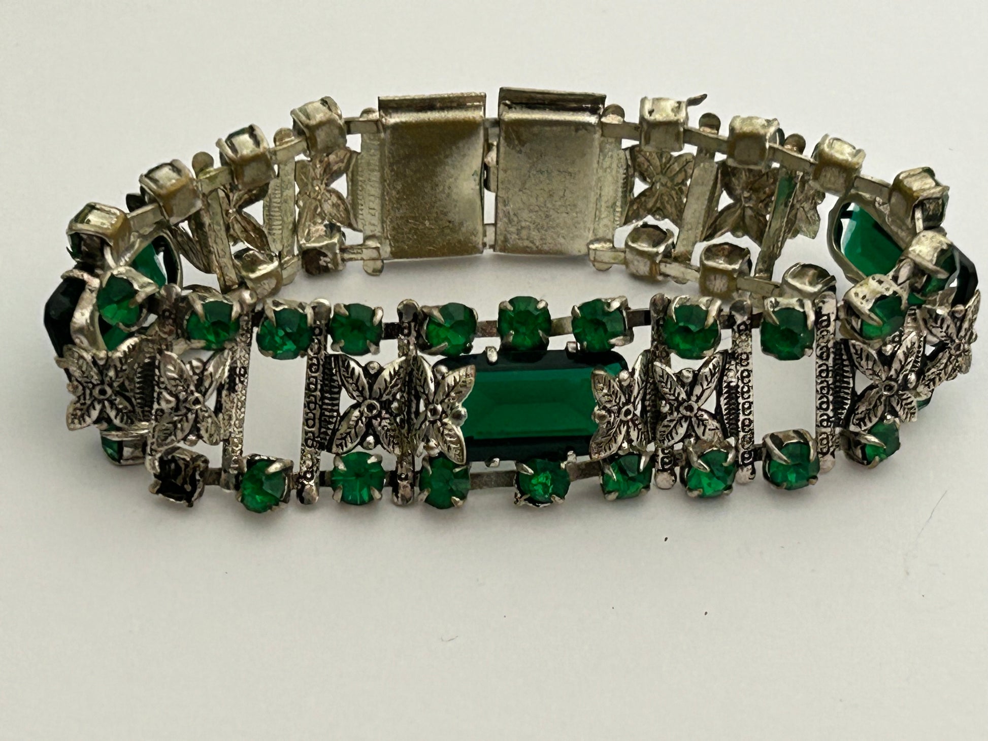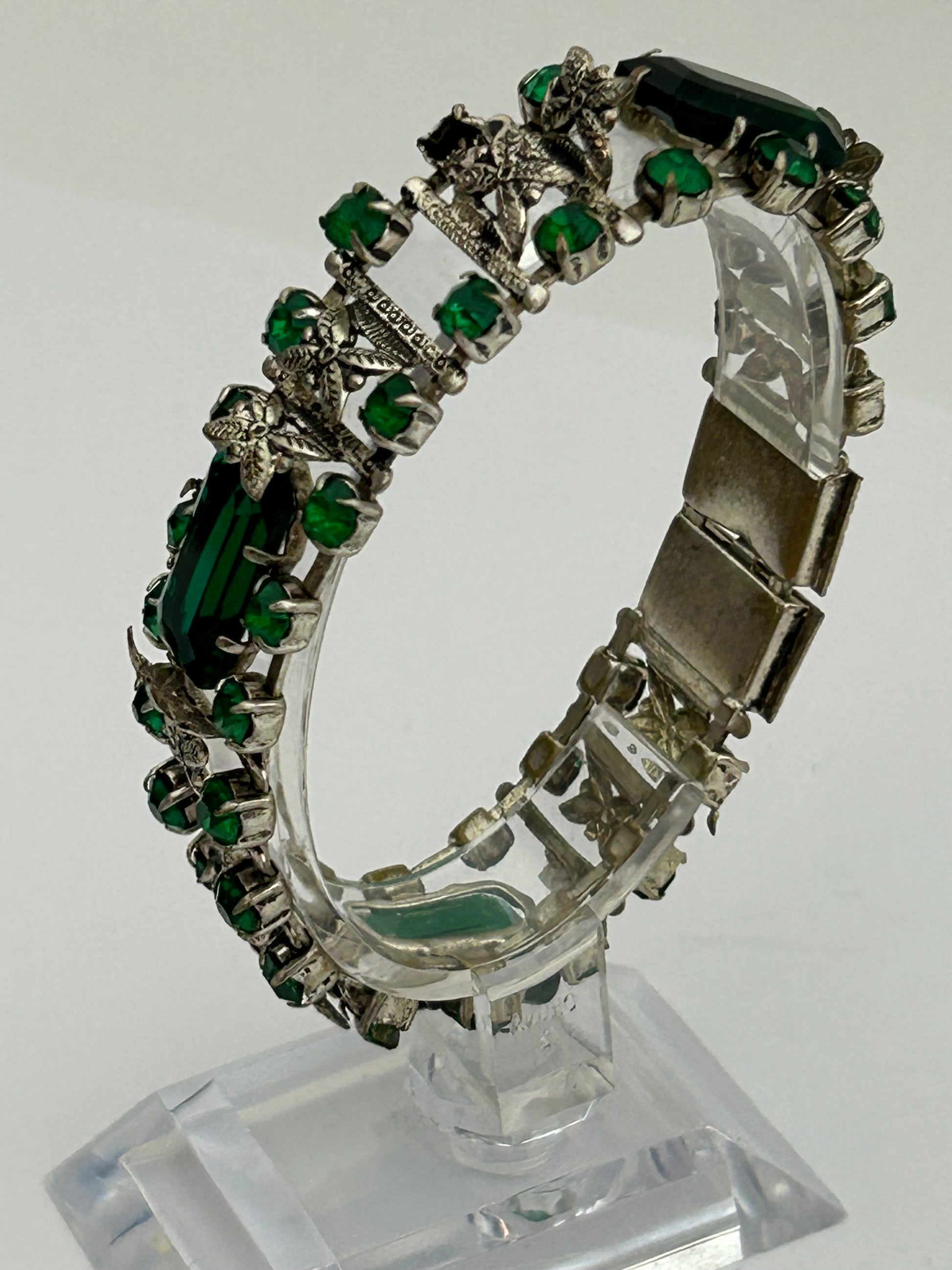 It is a panelled style bracelet set with green diamantes and large green glass baguette stones. There are two diamantes missing as mentioned.