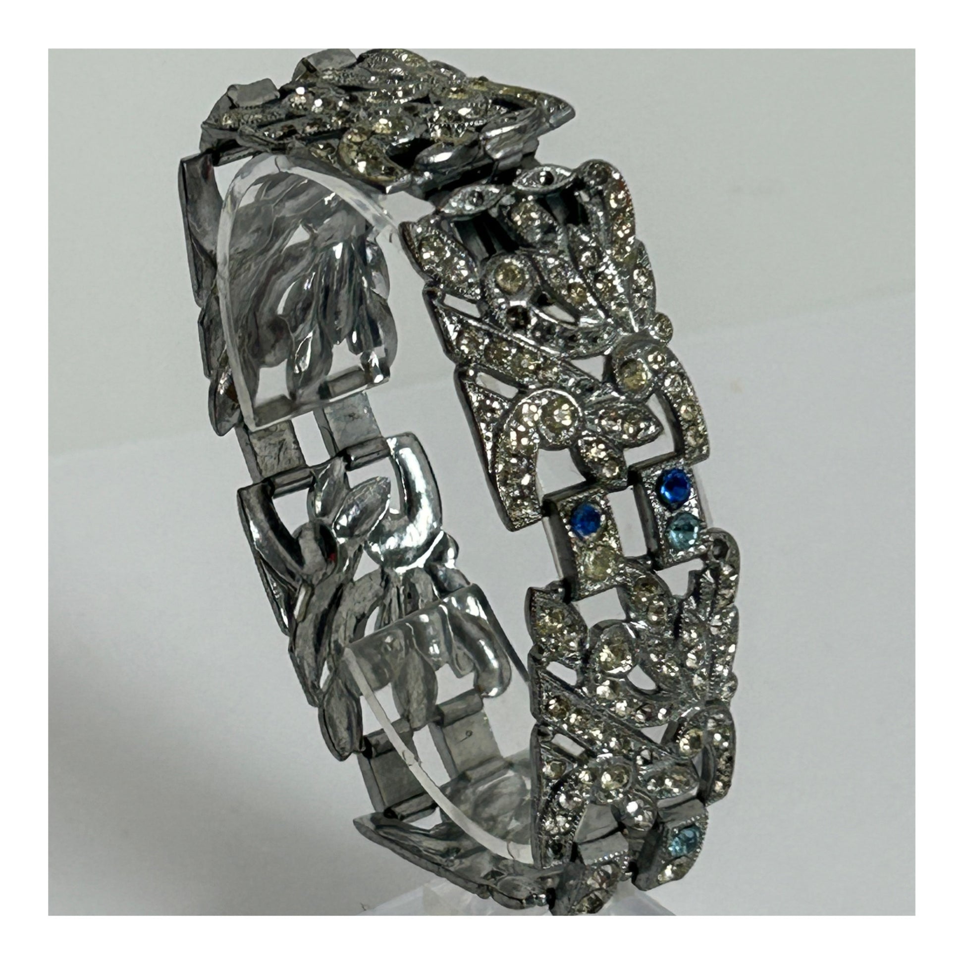 Condition - Good condition for its age but please note that there are few missing stones. It would probably benefit from a little clean. The larger diamante stones in the links are mismatched colour wise. Some are dark blue, some are light blue, some are clear.