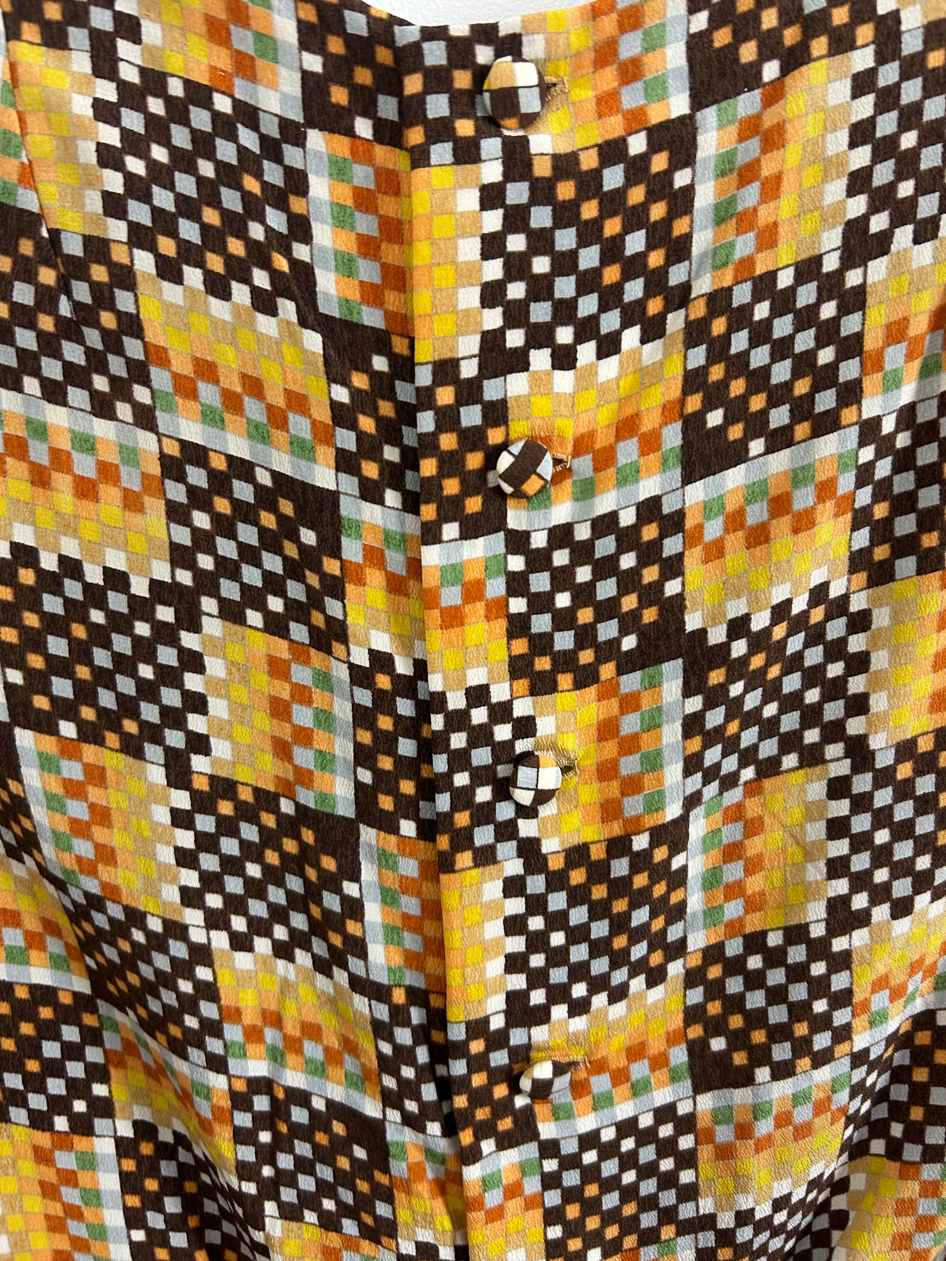Vintage 1970s Size 10 Brown Mustard Rust Mix Square Grid Print Silk Button Back Blouse/Top