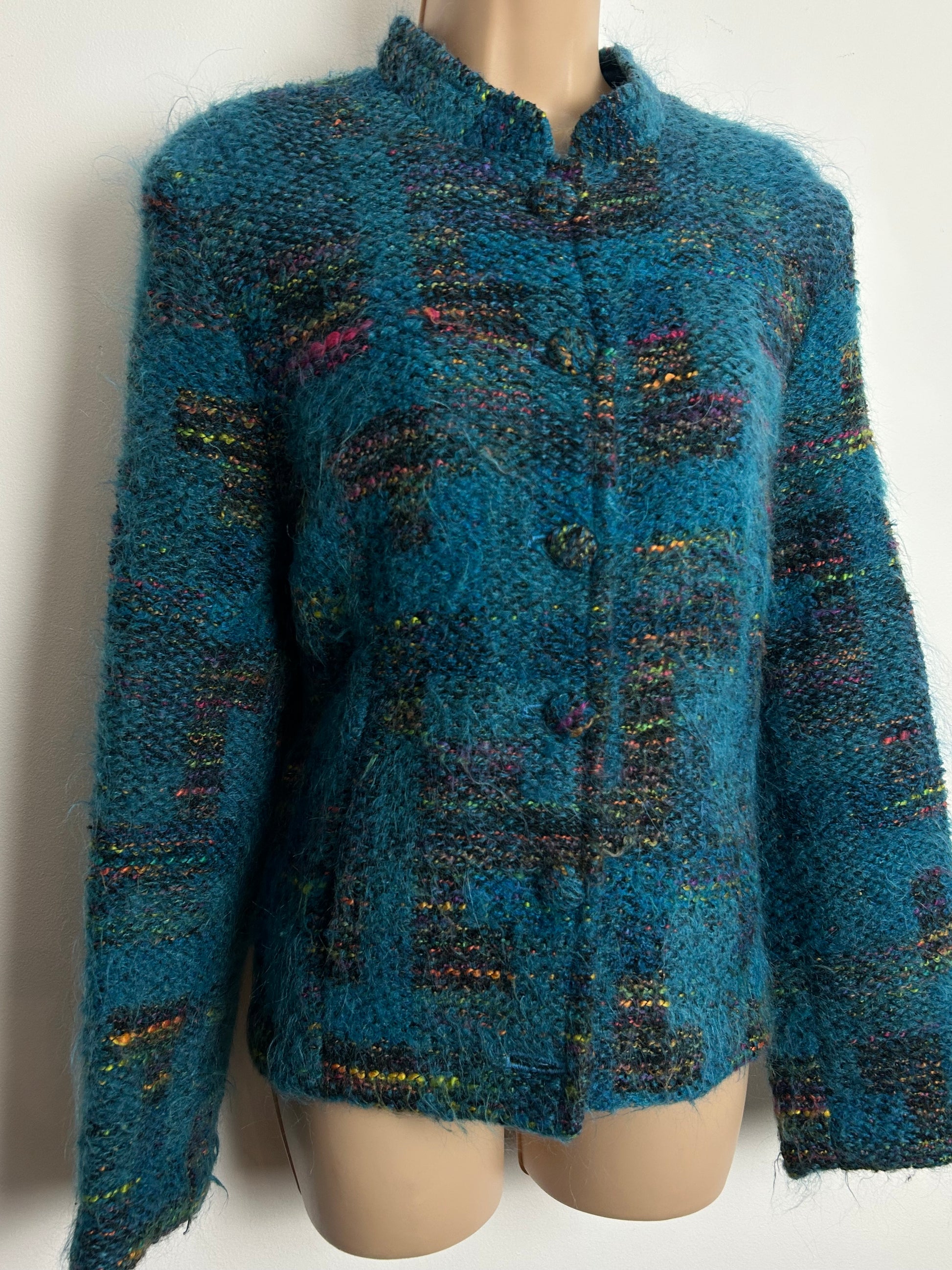 Vintage Early 1980s Size 12-14 Peacock Blue Mohair & Wool Mix Collarless Jacket