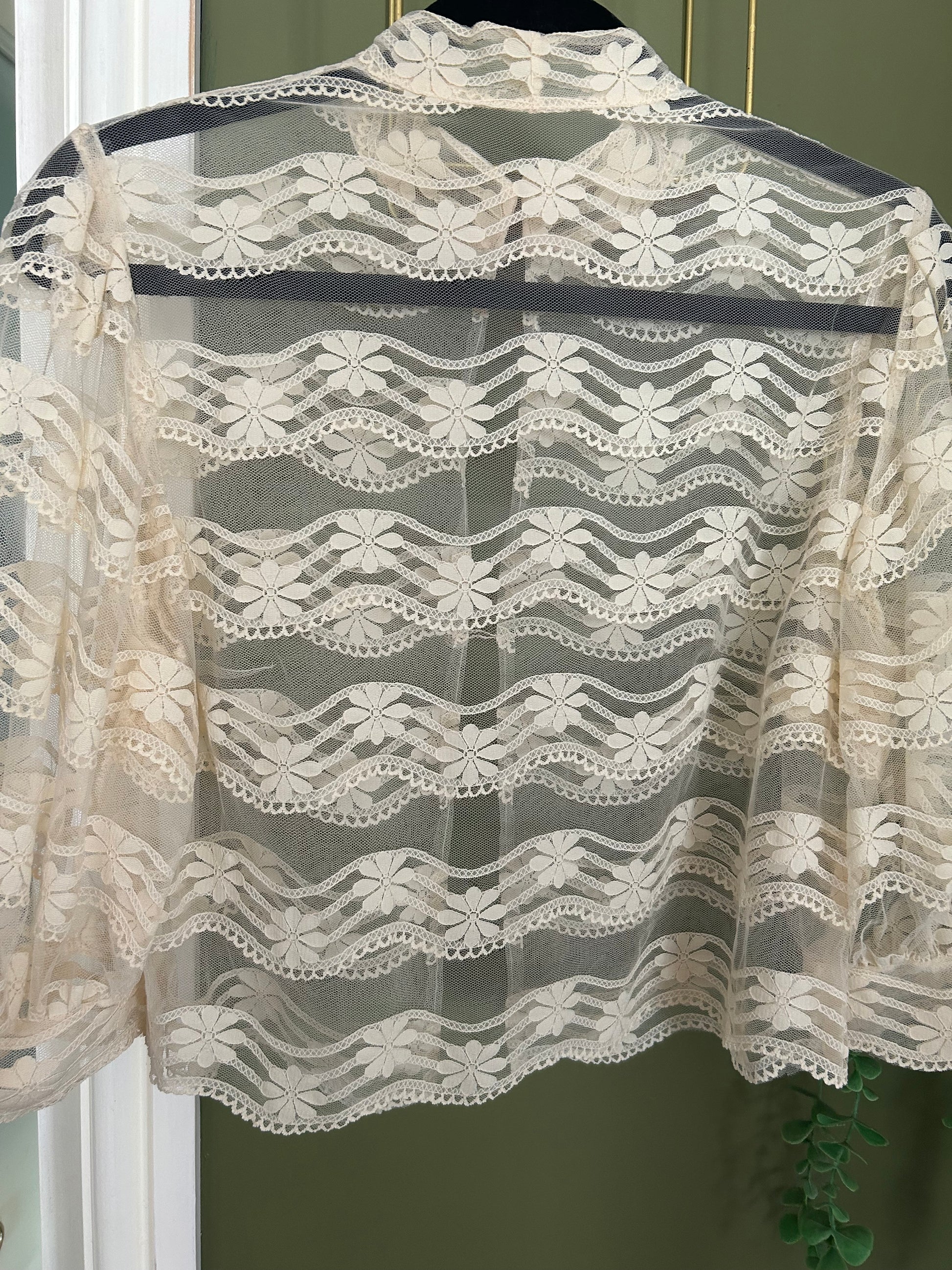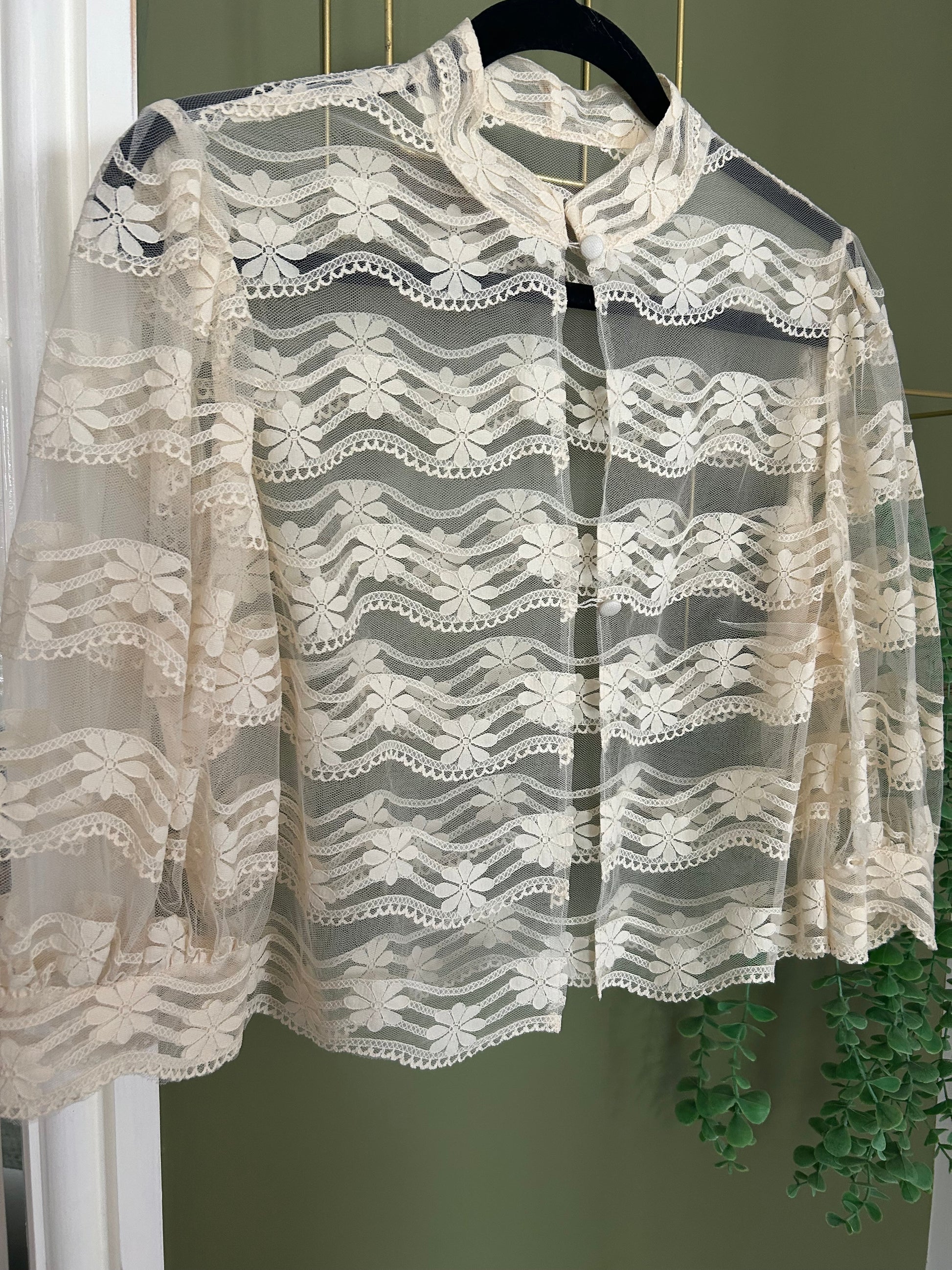 Vintage 1960s Size 12 Beautiful Cream Lace Net 3/4 Sleeve Semi Sheer Blouse Top