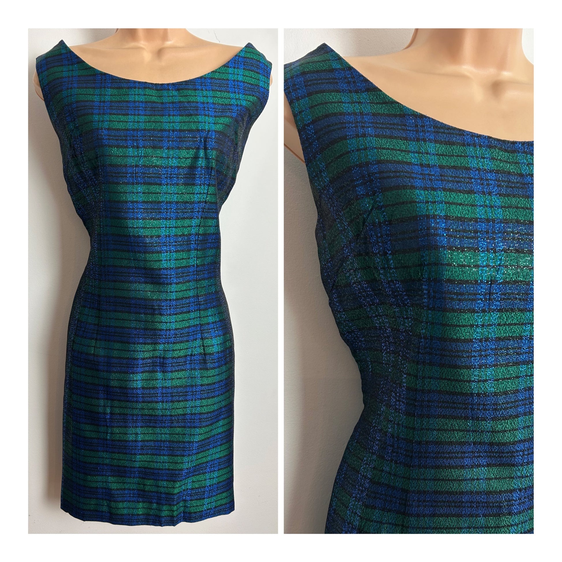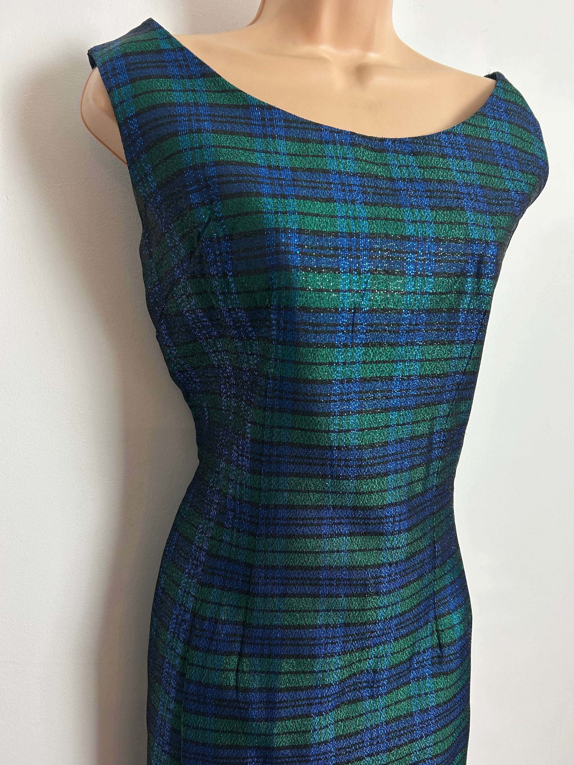 Vintage 1960s Size 12 Blue & Green Lurex Tartan Check Sleeveless Wiggle Party Dress