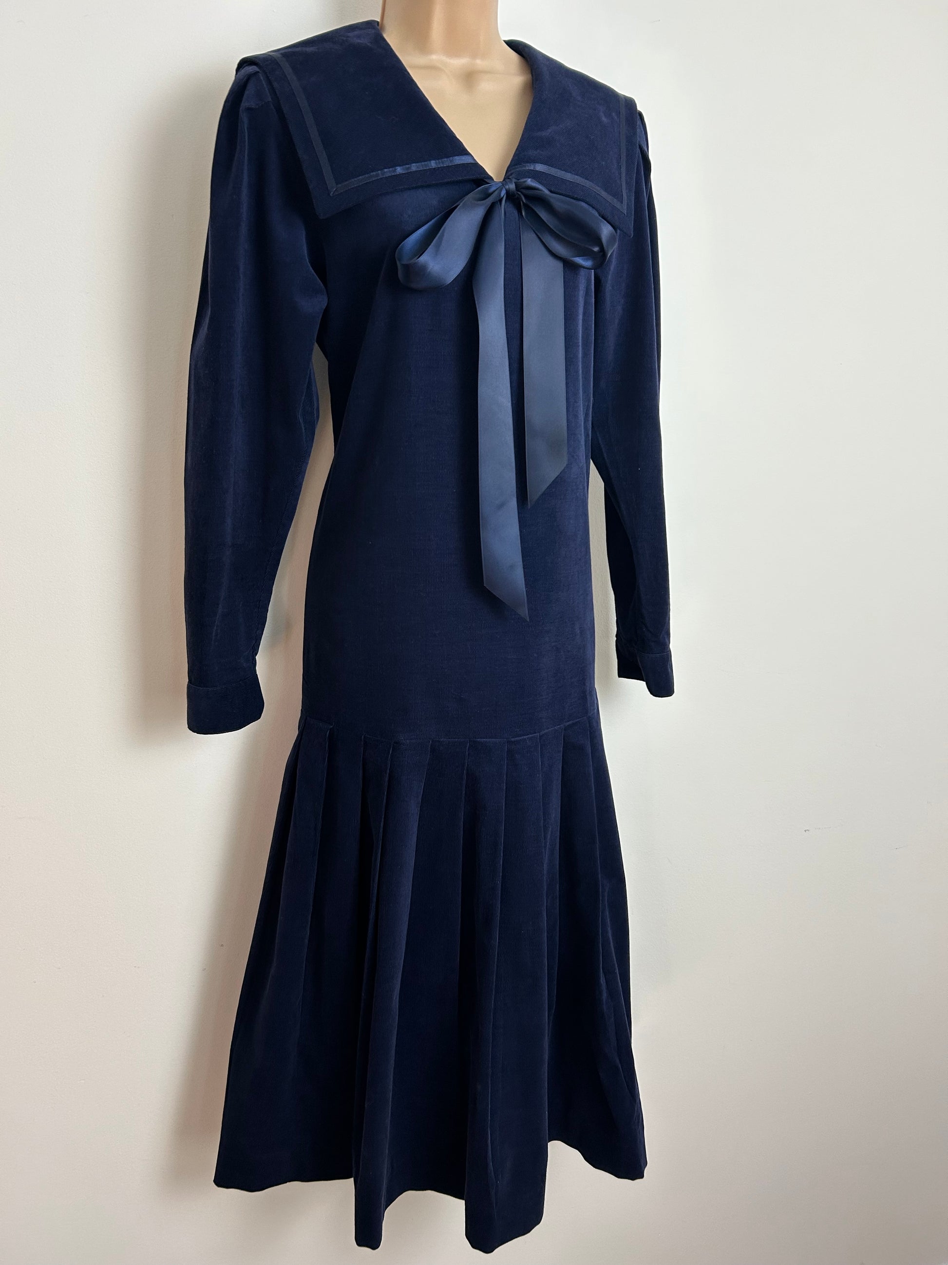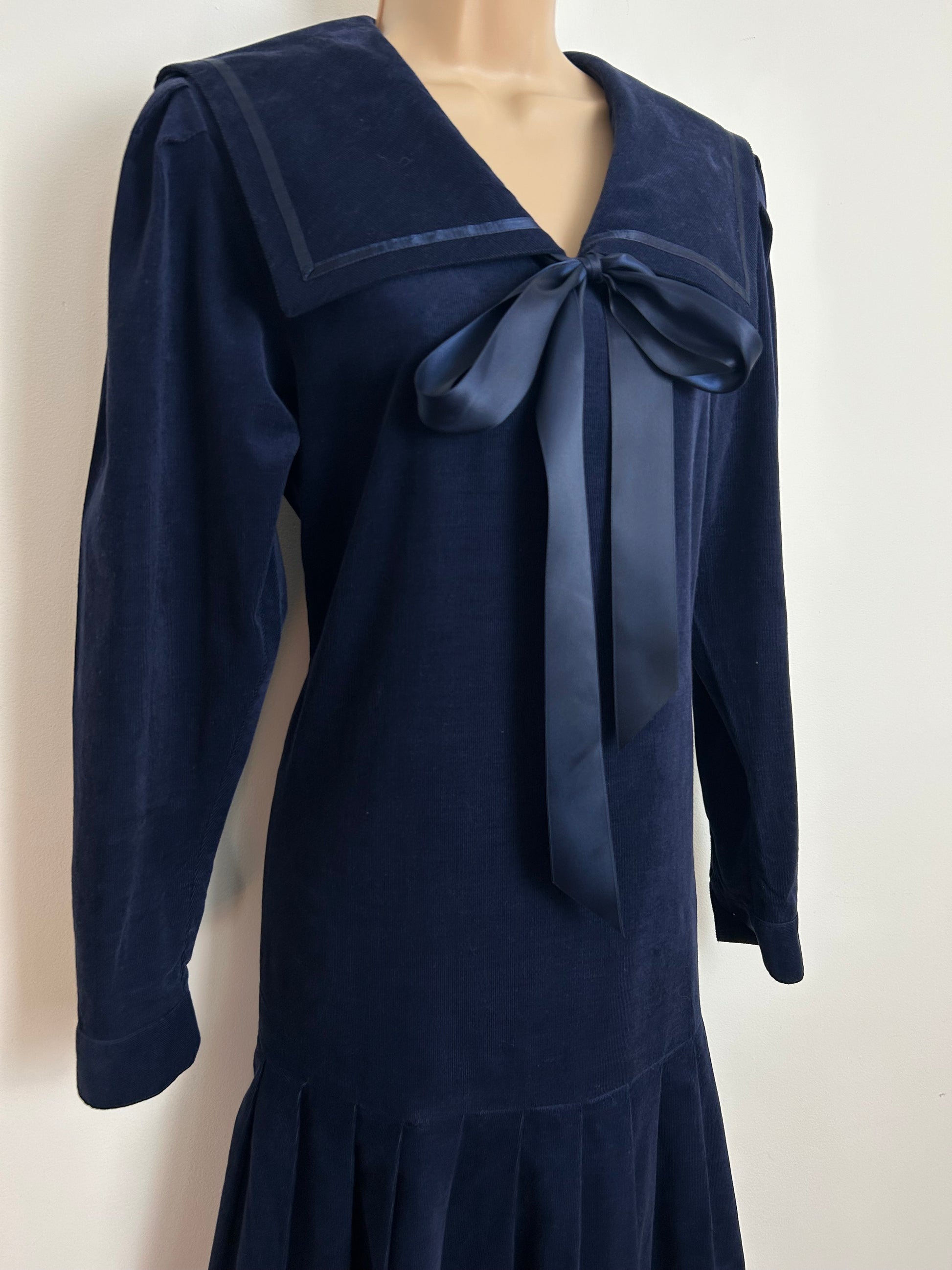 Vintage 1980s LAURA ASHLEY Size 12 Navy Blue Fine Cotton Needlecord Sailor Collar Ribbon Tie Pleated Midi Dress