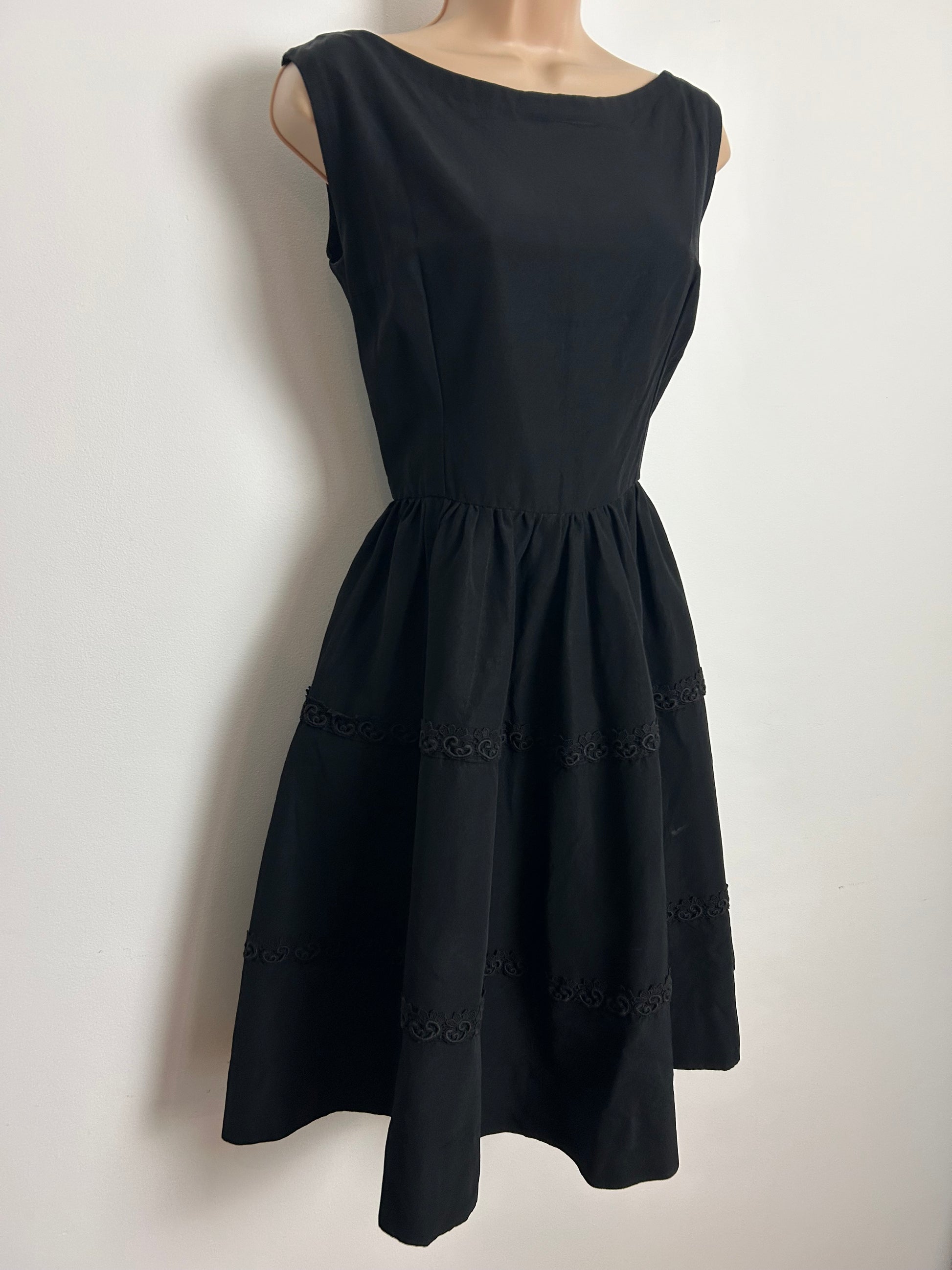 Vintage Late 1950s Size 8 Black Sleeveless Guipure lace Trim Fit & Flare Dress