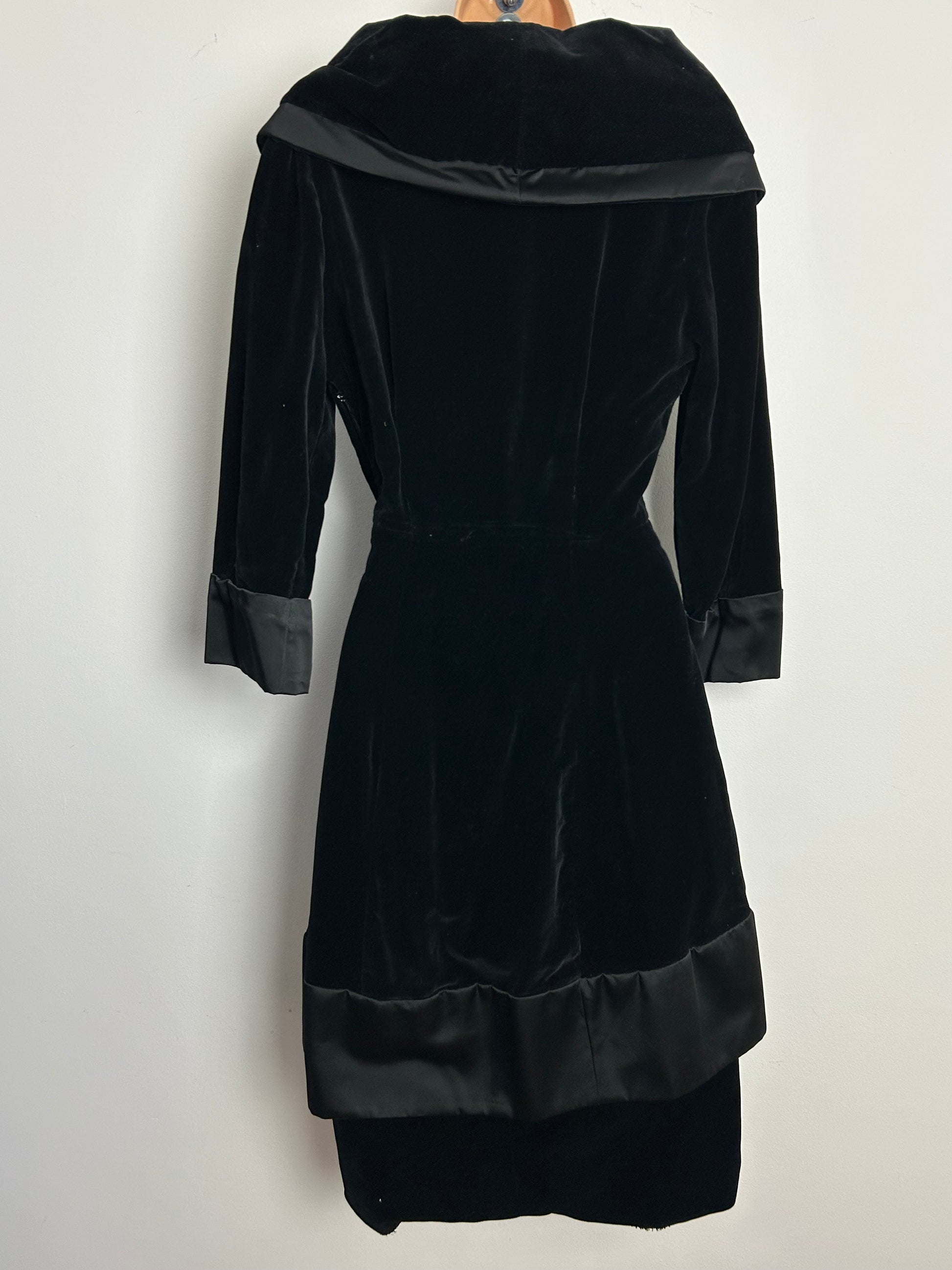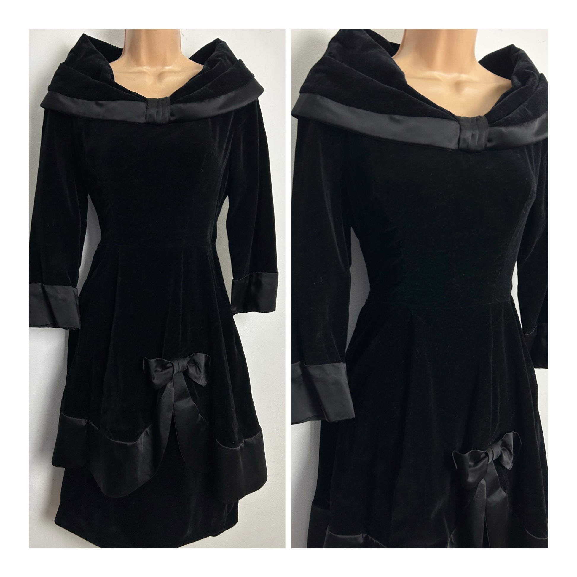 Vintage 1960s Size 8 Black Velvet Bardot Collar Bow Detail Evening Occasion Dress