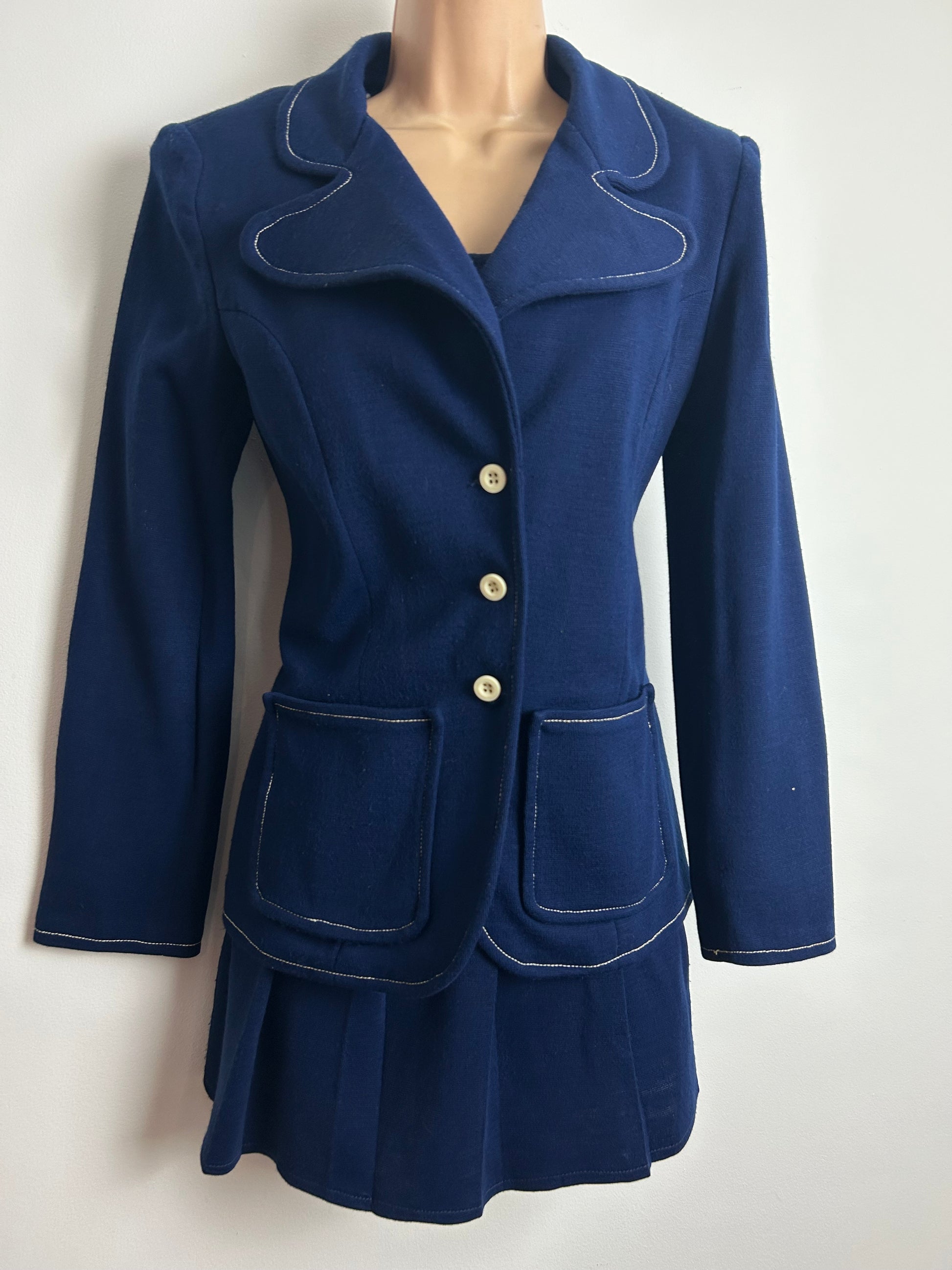 Vintage 1960s Size 8 Navy Blue Polka Dot Pleated Mini Mod Suit: Dress & Matching Jacket