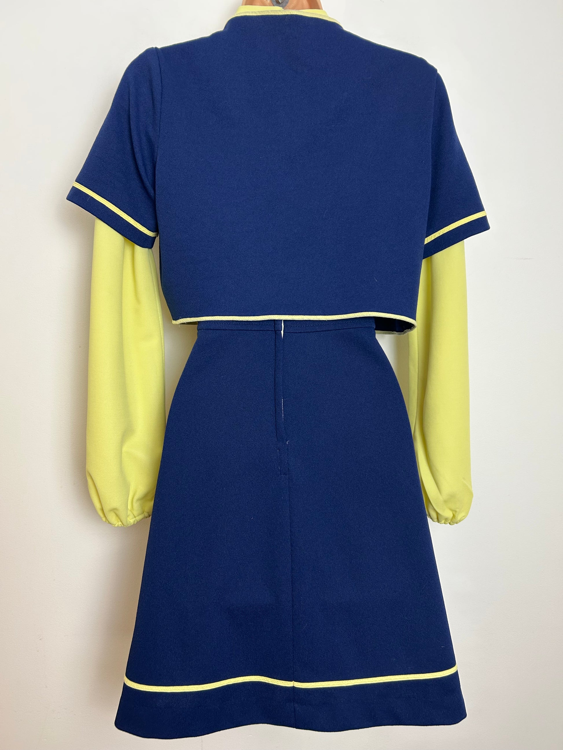 Vintage 1960s Size 8 Navy Blue & Yellow Scarf Neck Long Sleeve Mod Dress & Matching Jacket