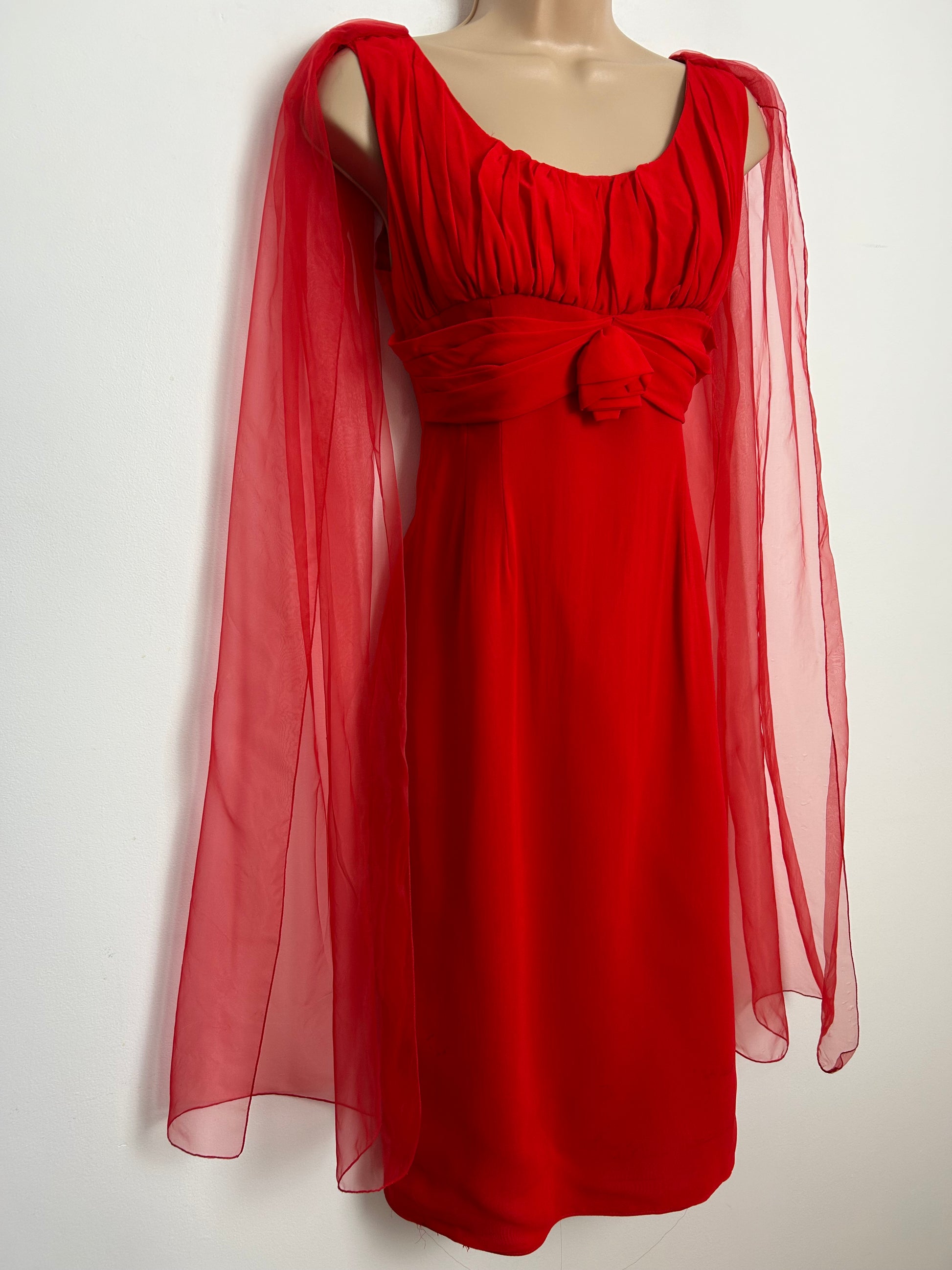 Vintage 1960s Size 8 Red Chiffon Watteau Shoulder Train Fitted Wiggle Occasion Evening Dress
