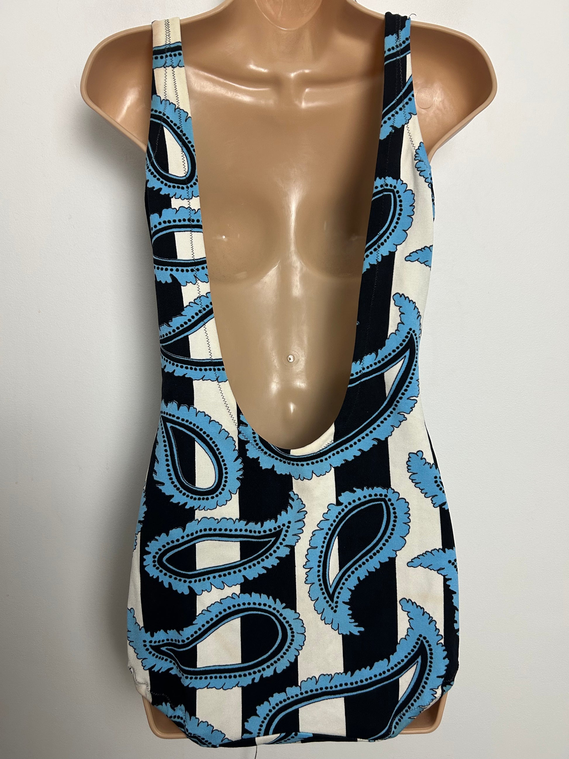 Vintage 1960s TRIOLA Size 16 Black White & Blue Stripe & Paisley Print Moulded Cup Swimsuit