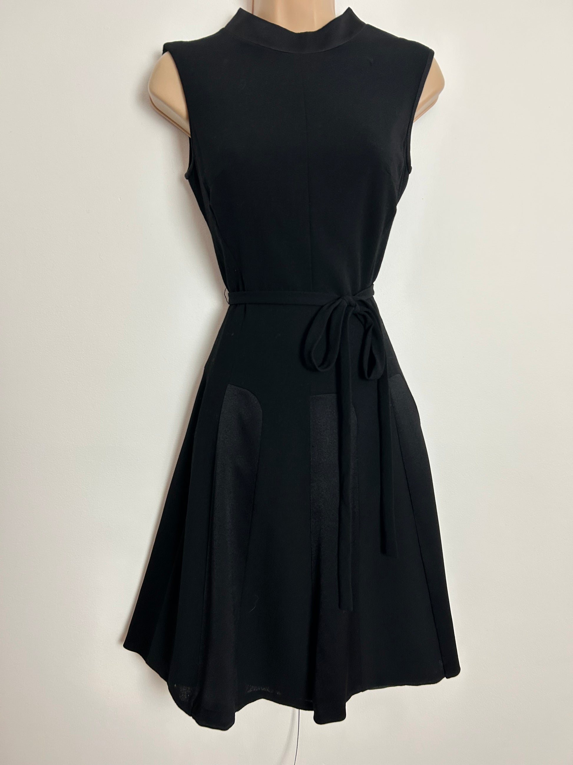 Vintage 1960s UK Size 8 Black Sleeveless Belted Fit & Flare Satin Panel Mod Dress