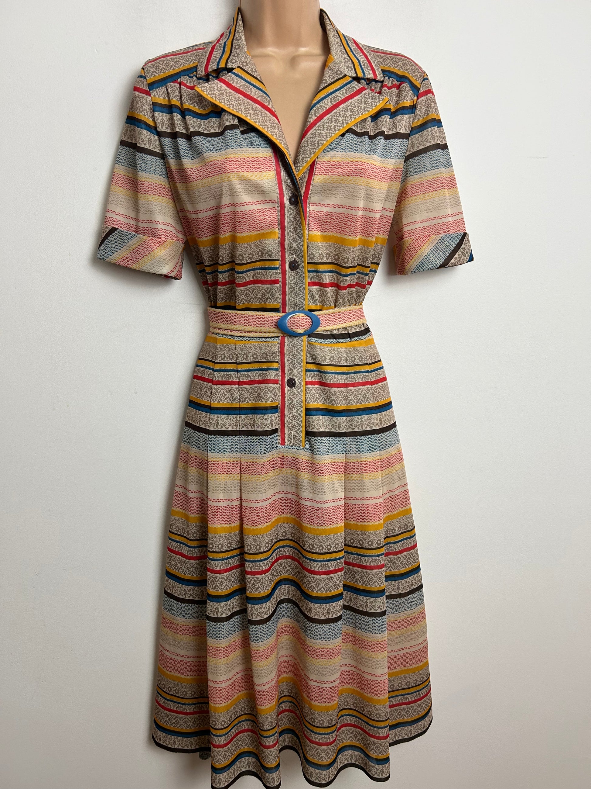 Vintage 1970s Approx Size 10 Beige Red Blue & Mustard Stripe Print Belted Pleated Day Dress