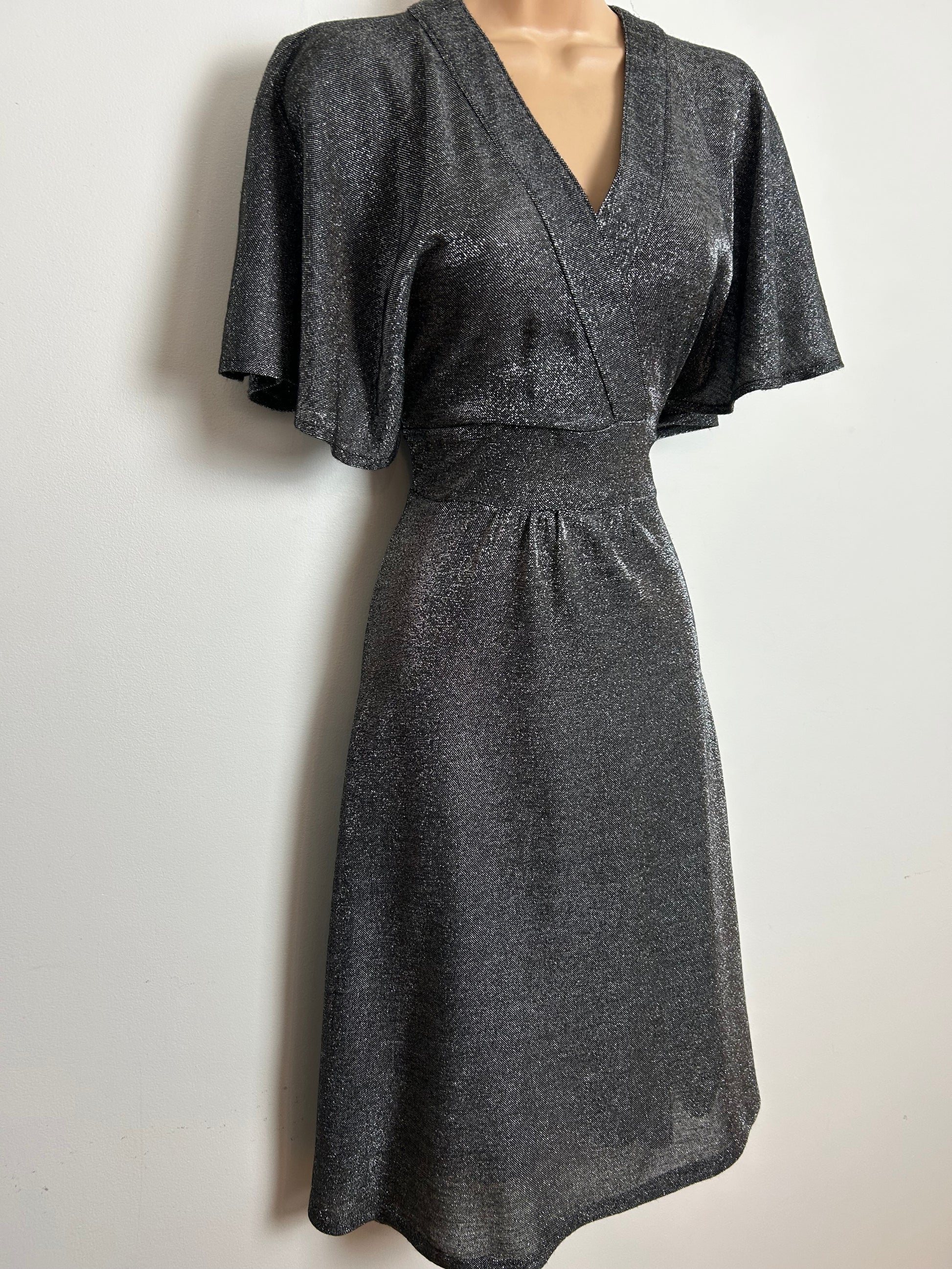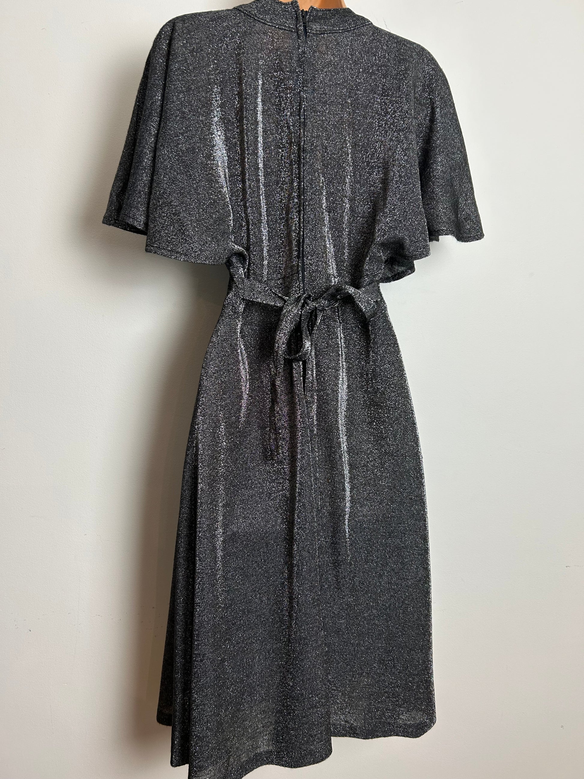 Vintage 1970s ARIES Size 10 Black & Silver Lurex Glittery Flutter Sleeve Tie Back Xmas Party Evening Dress