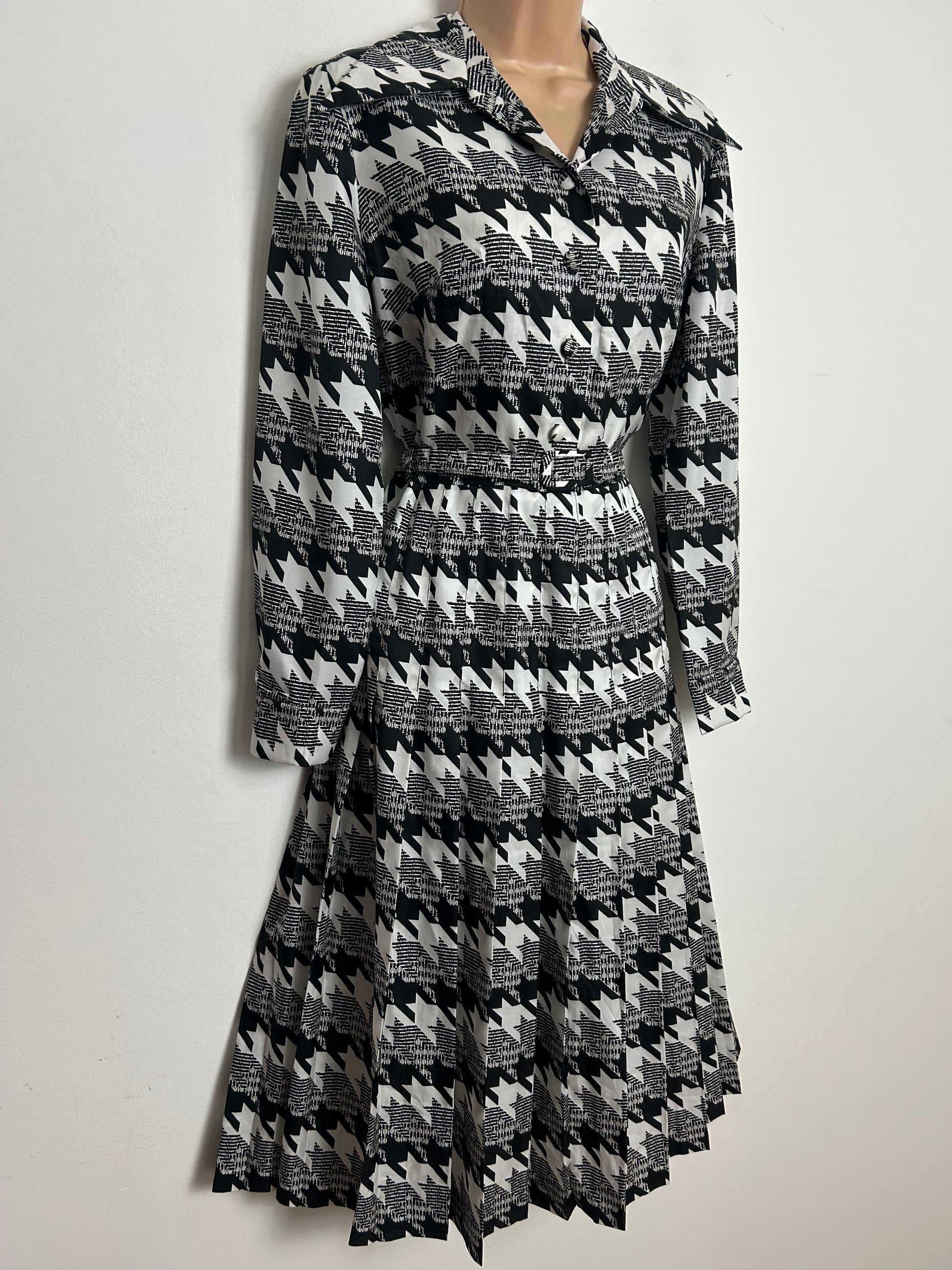 Vintage 1970s BUSSE COUTURE Size 10 Black & White Dogtooth Check Dagger Collar Belted Pleated Dress