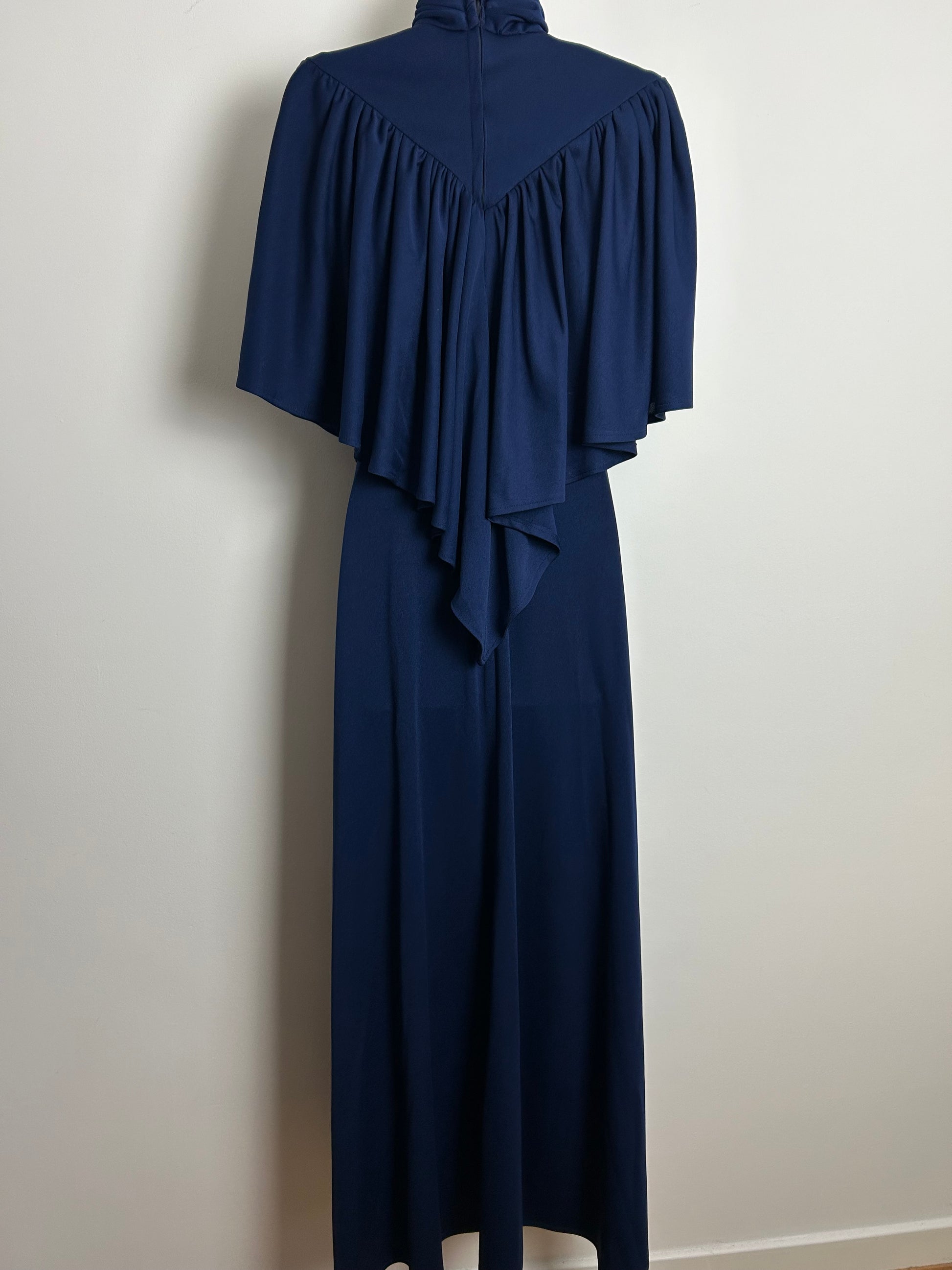 Vintage 1970s C&A Size 10 Navy Blue Cape Sleeve Bertha Collar Evening Occasion Maxi Dress