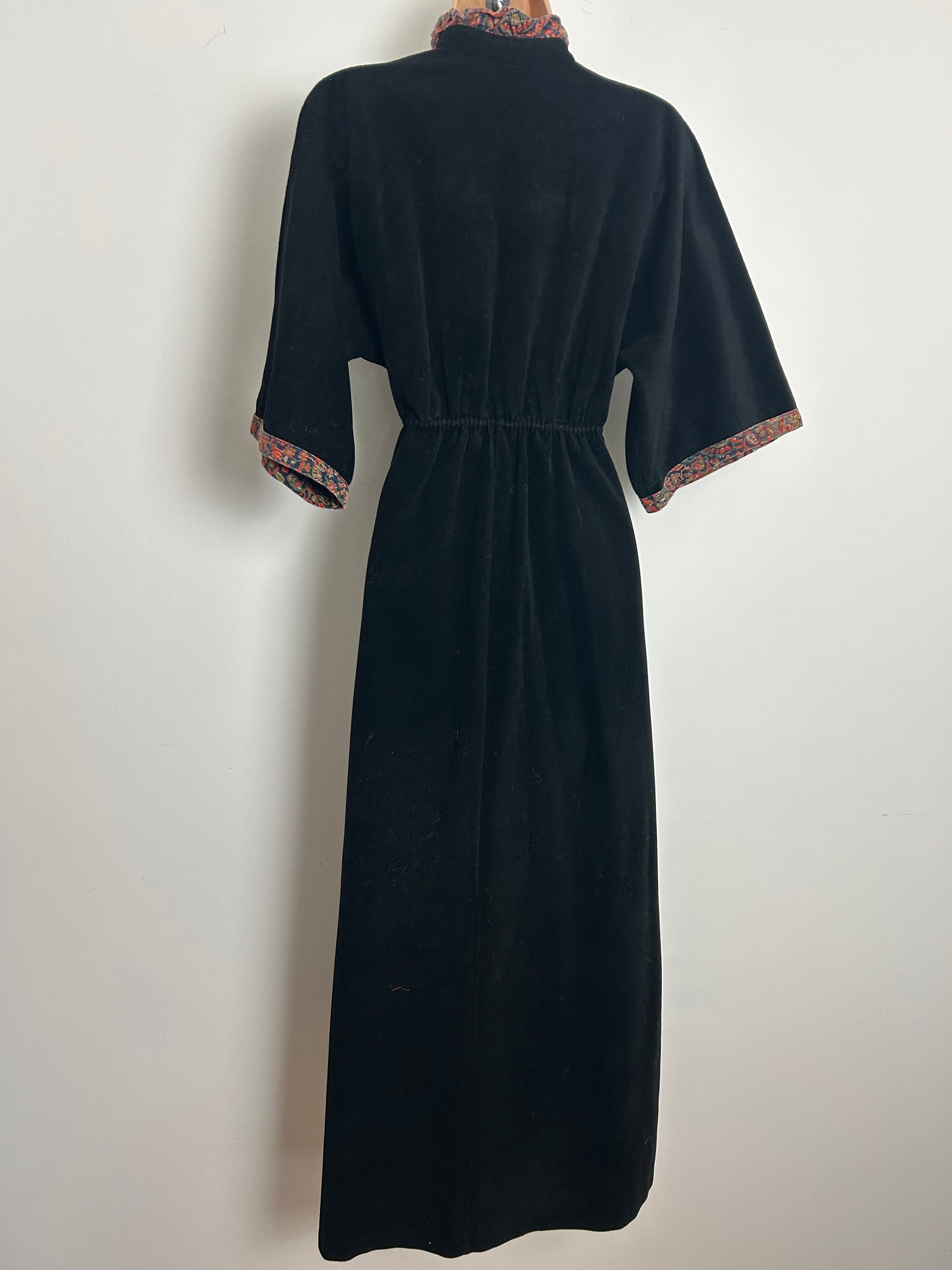 Vintage 1970s Size 8 Black Blue & Orange Cord Panel Short Wide Sleeve Boho Prairie Velour Maxi Dress