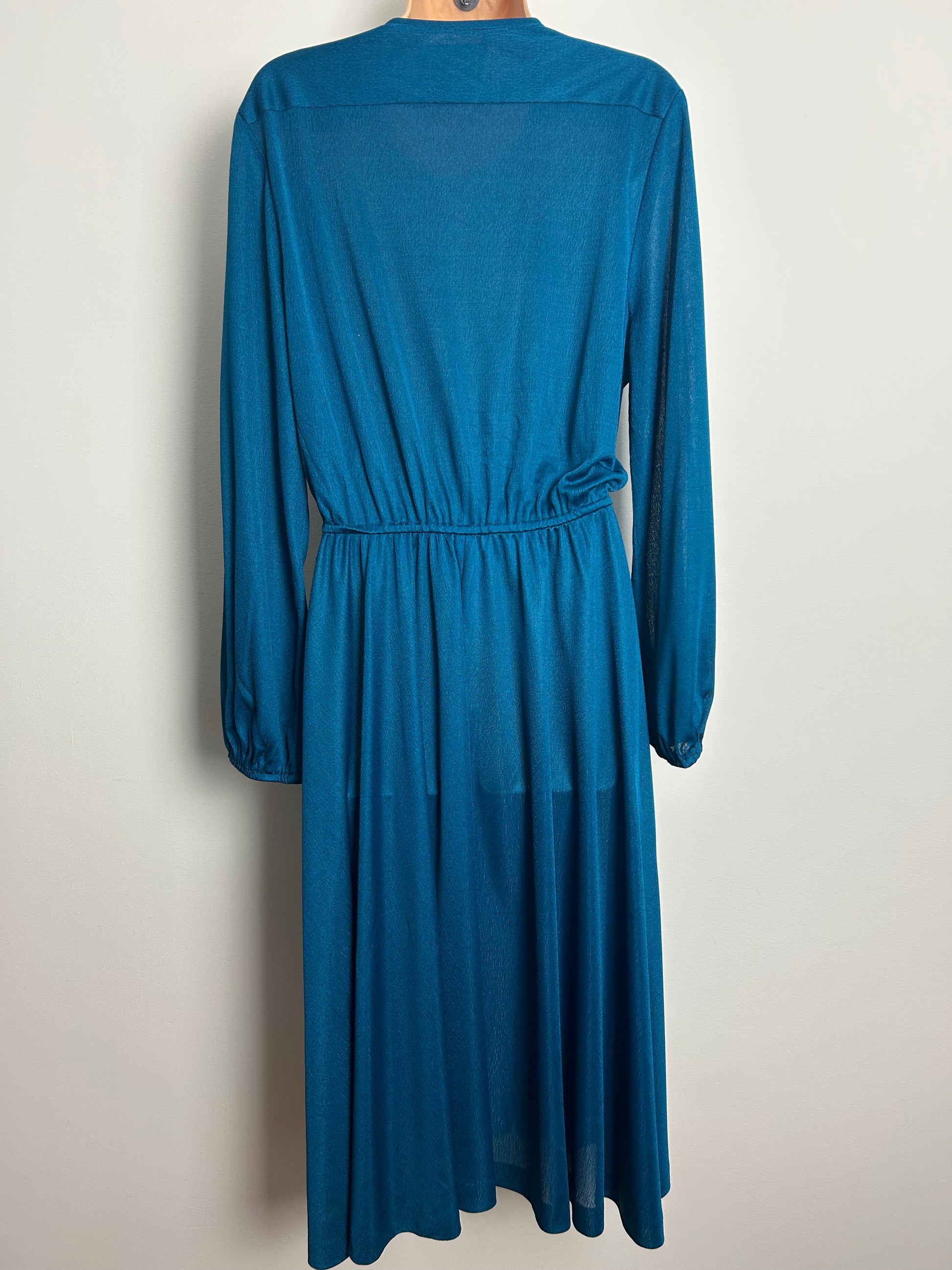 This lovely vintage day dress is made from 100% polyester in peacock blue.