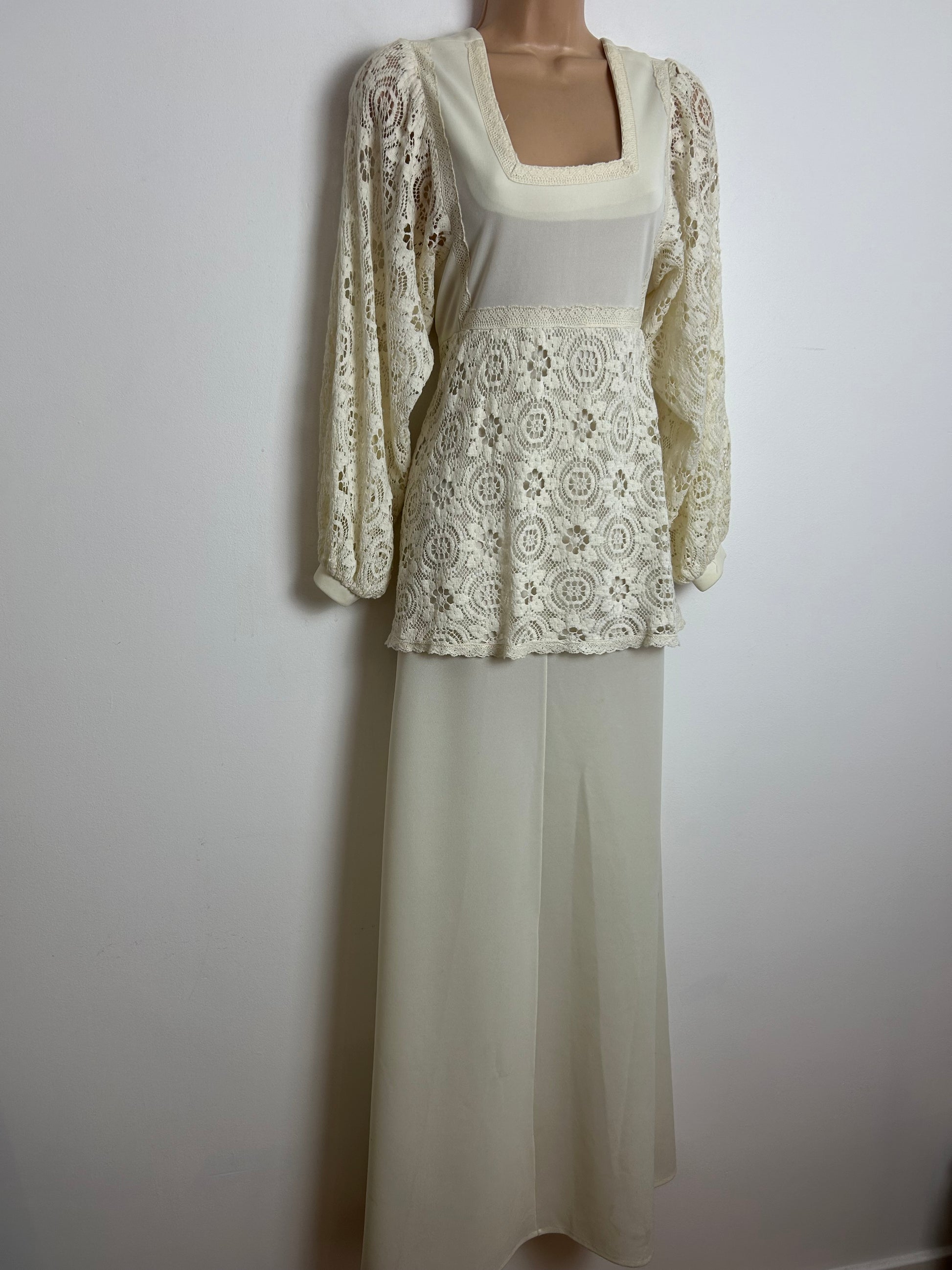 Vintage 1970s FREEMANS OF LONDON Size 10 Cream Lace Sleeve Layered Boho Maxi Dress