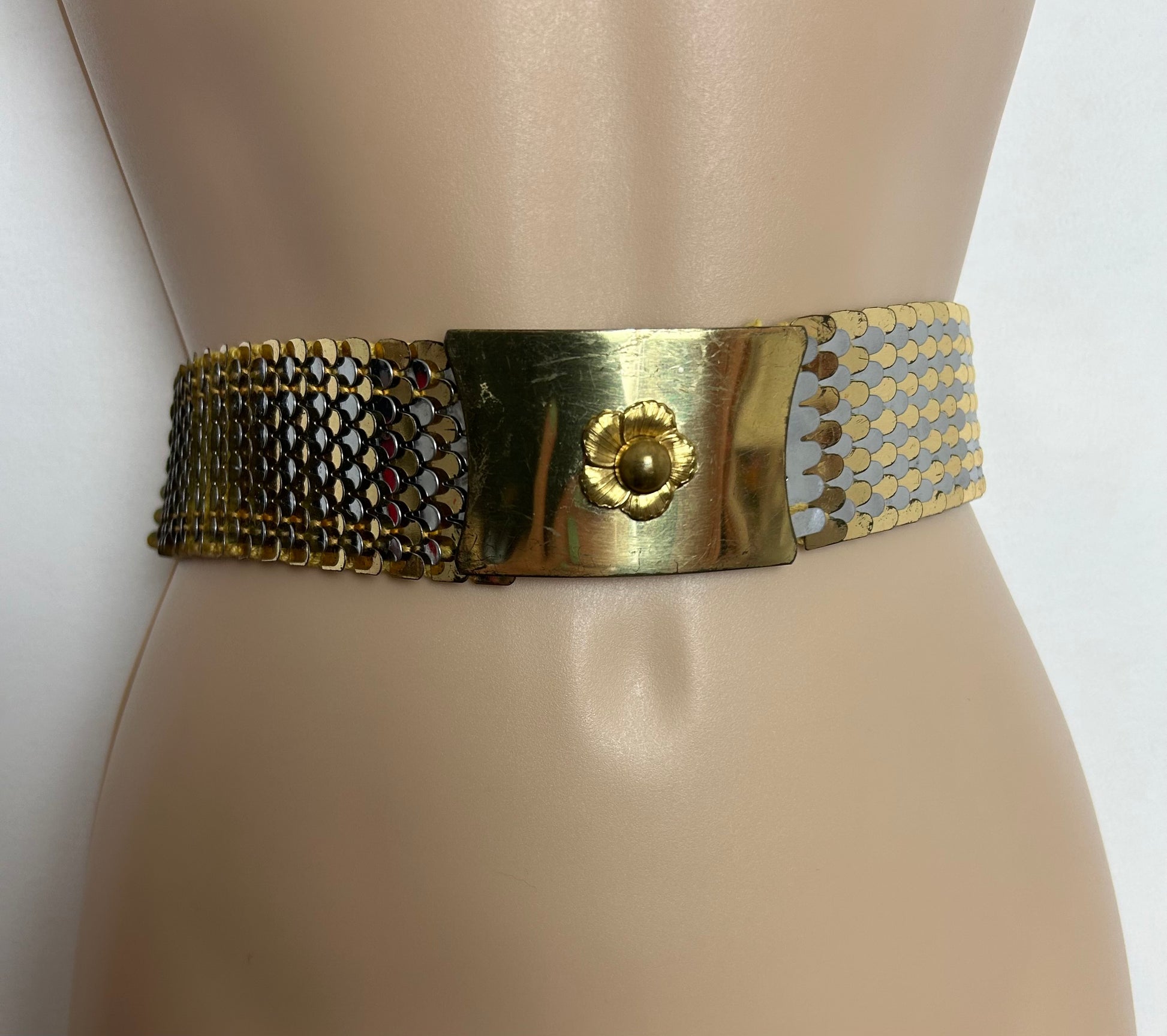 This fab vintage belt is made from gold & silver base metal fish "scales".