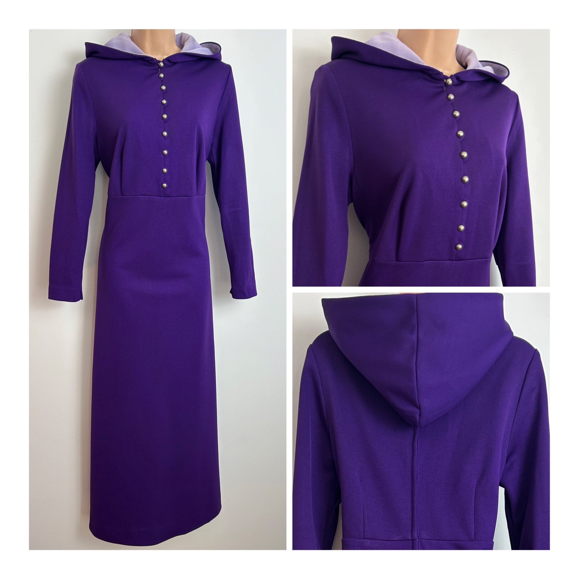 Vintage 1970s HENRIQUES OF LONDON Size 14 Purple Hooded Long Sleeve Maxi Dress
