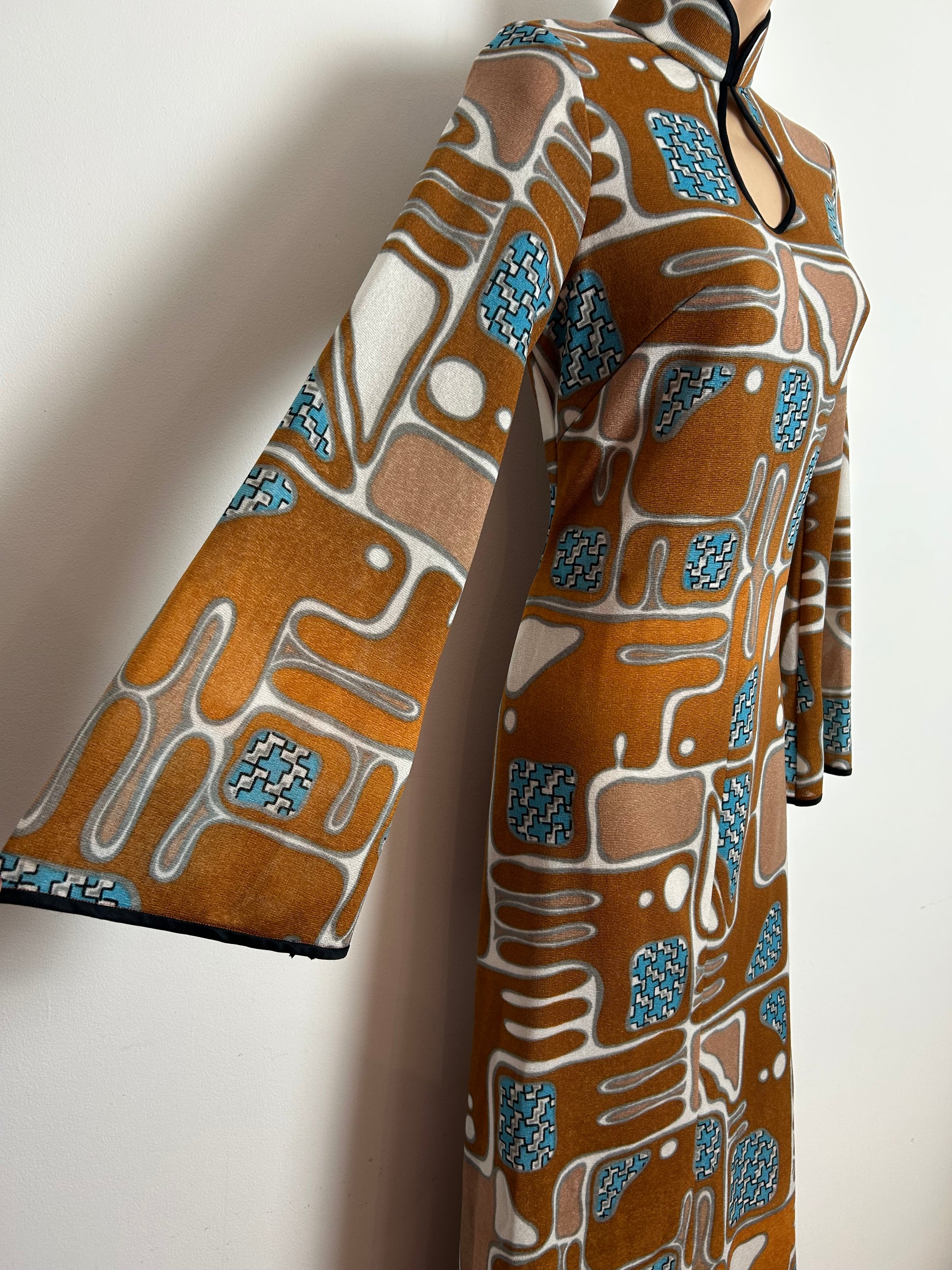 This gorgeous vintage maxi dress is made from a polyamide type fabric in tan brown blue & white abstract print. It does have some stretch to it.