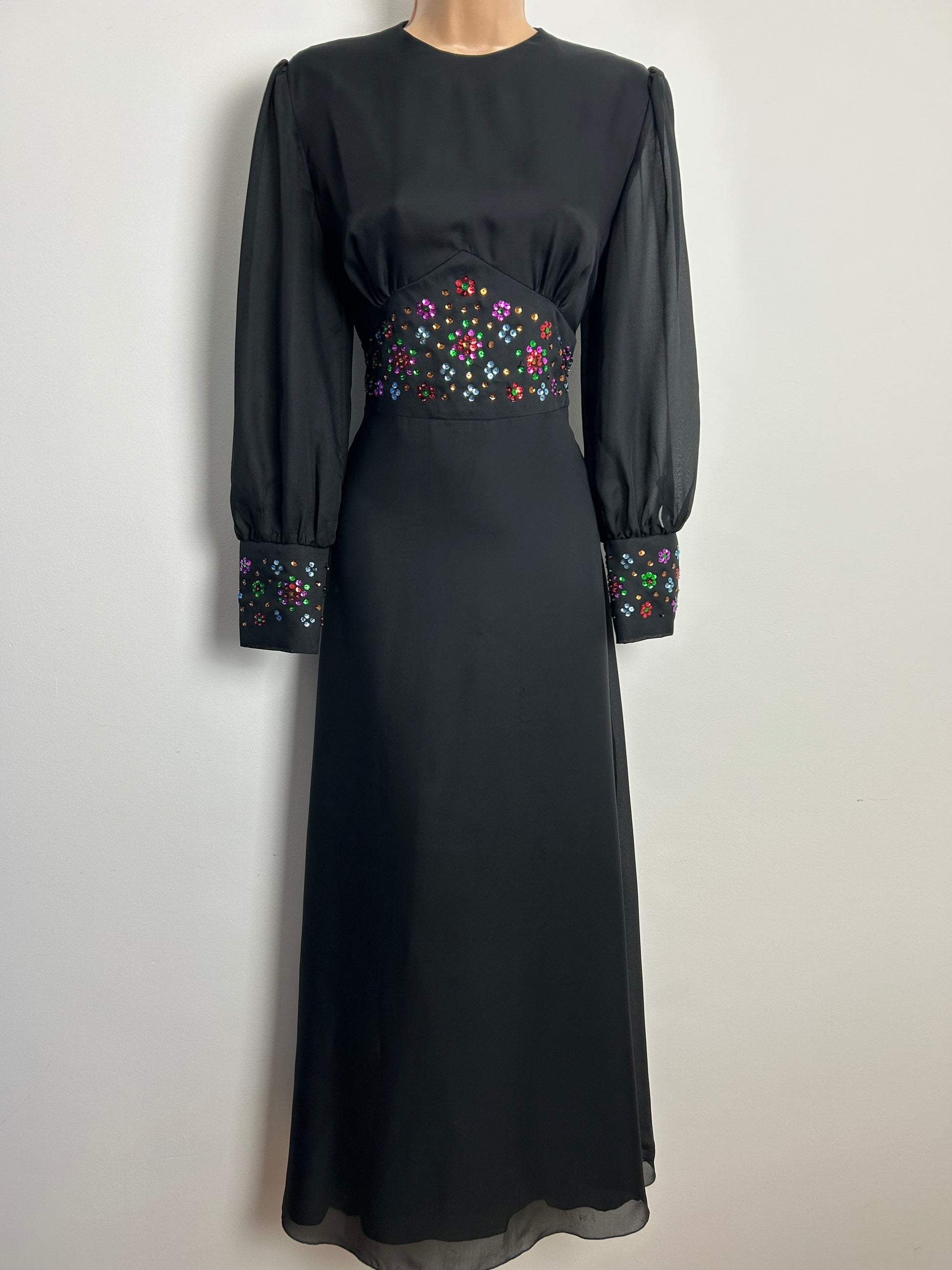 Vintage 1970s KLEEMIER HOFF Size 10 Black Chiffon Multicolour Sequin Detail Long Sleeve Occasion Maxi Dress