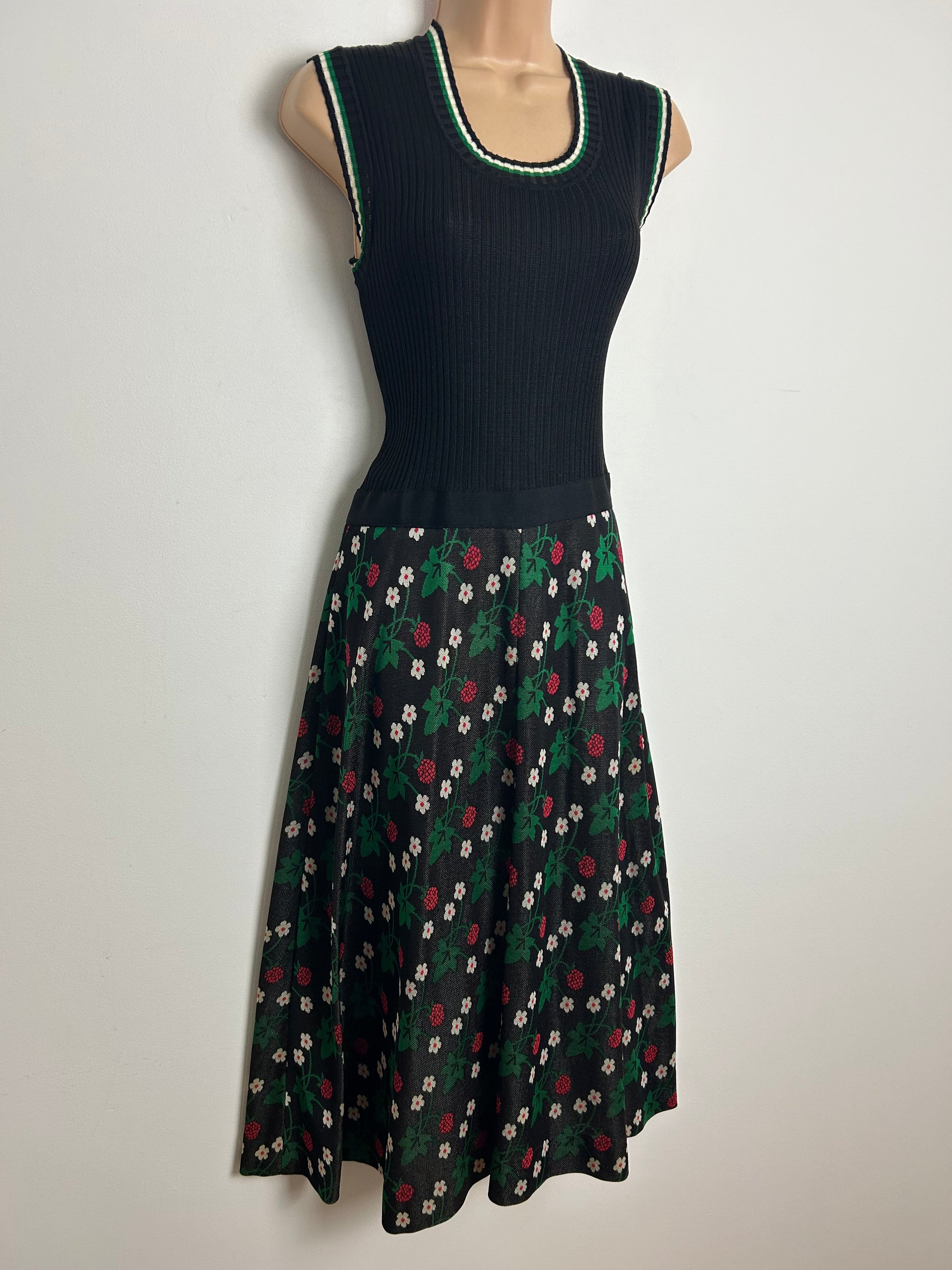 Vintage 1970s LANVIN Approx Size 10 Black Green Red & White Ribbed Strawberry Pattern Dress