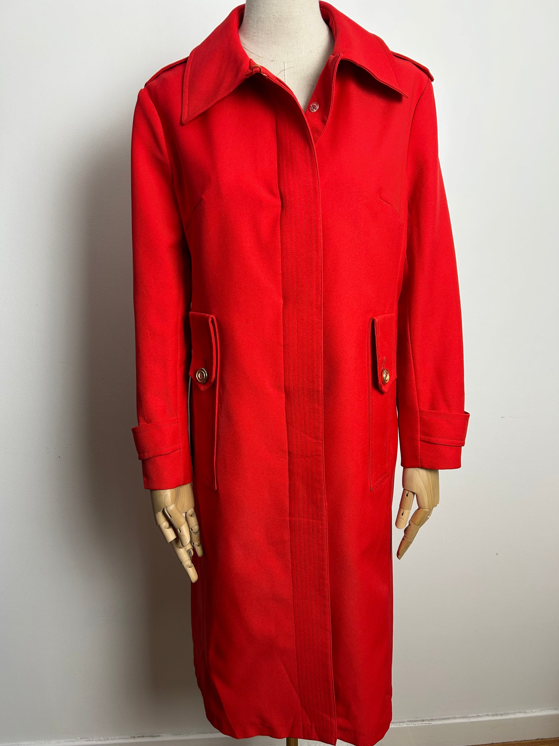 This is a late 1960s red trench style coat from the Maincoat range. It should be belted but sadly the belt is missing. Which I have reflected in the price. With the belt it would have been listed at £65.