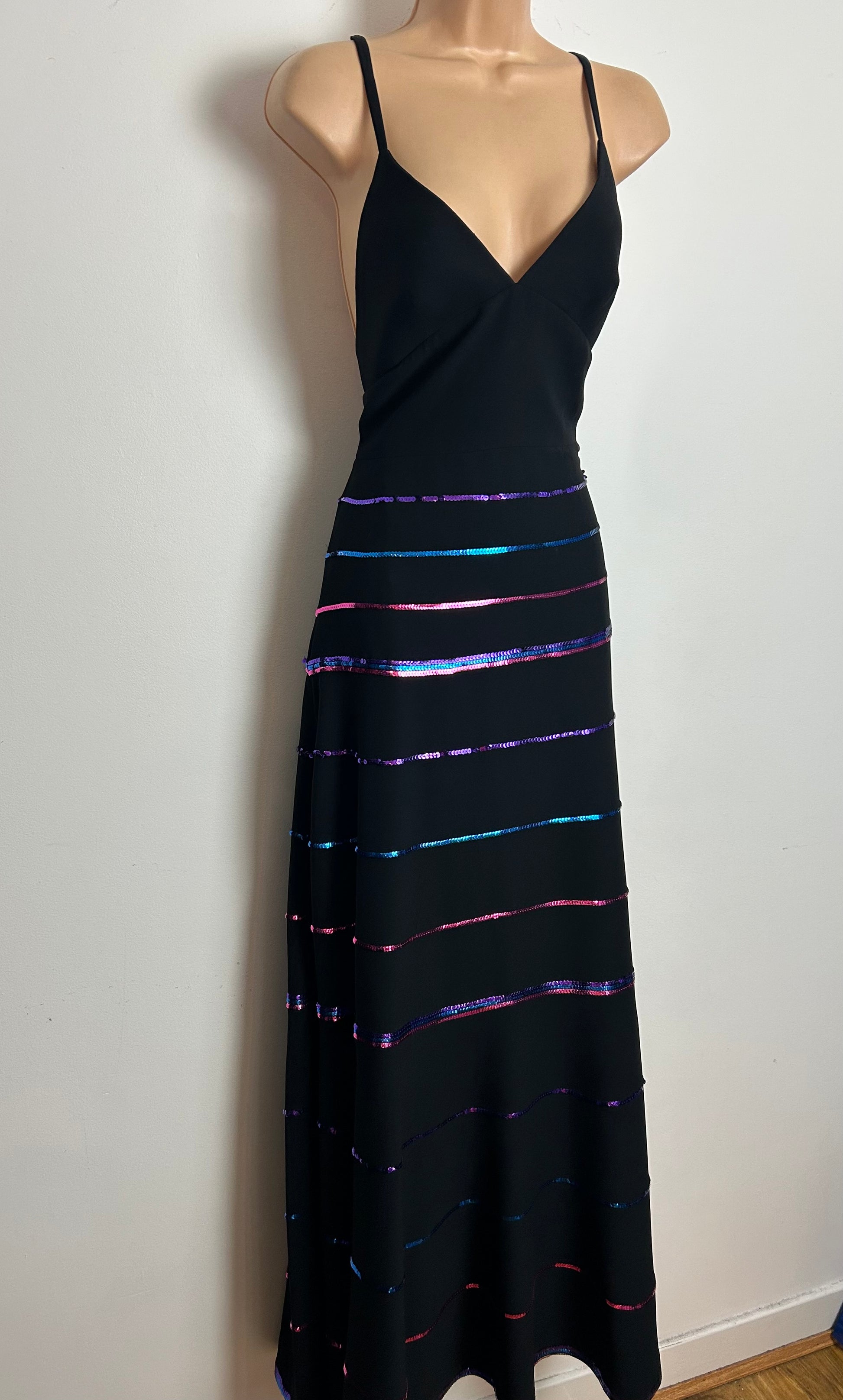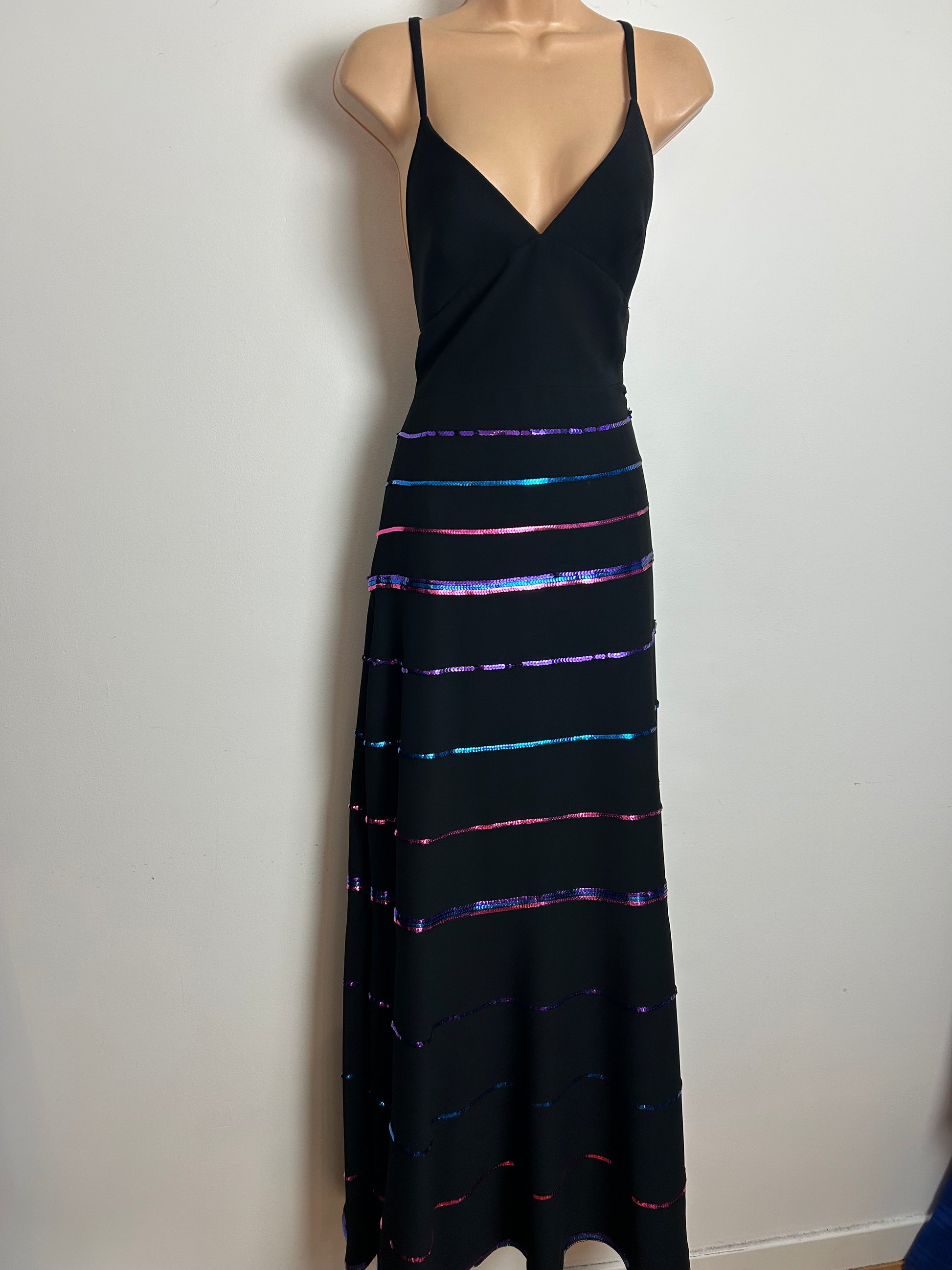Vintage 1970s LOUIS FERAUD Size 6 Black Halterneck Purple Blue & Pink Sequin Detail Evening Party Maxi Dress