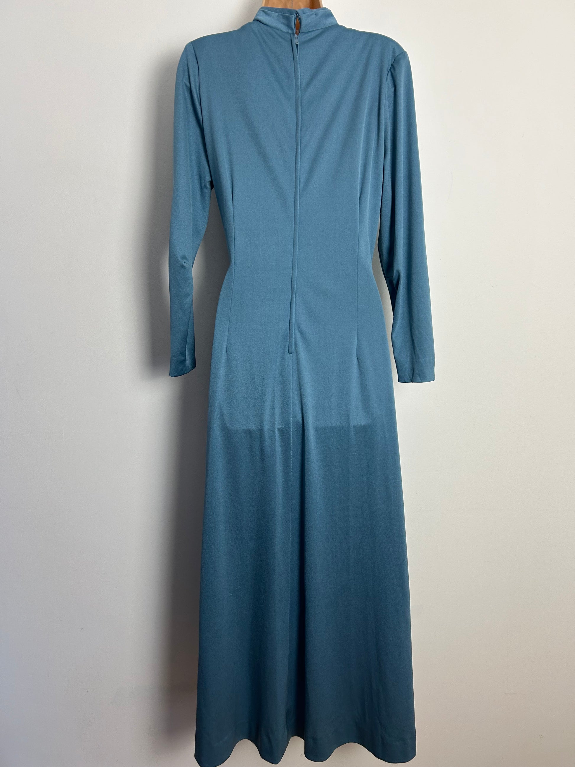 Vintage 1970s MARJON COUTURE & BAKER SPORTSWEAR UK Size 12 -14 Dusky Blue Long Sleeve Bead & Diamante Detail Occasion Maxi Dress