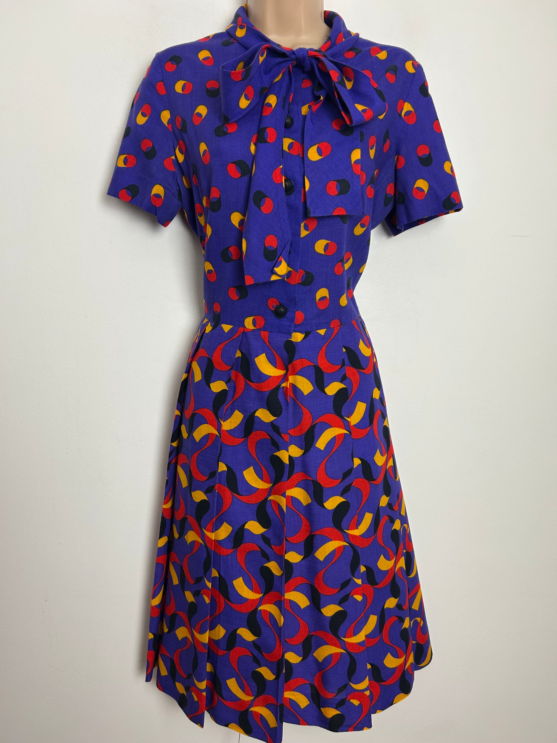 Vintage 1970s MONTIGO BAY Size 12 Blue Red & Mustard Yellow Abstract Print Pussy Bow Pleated Day Dress