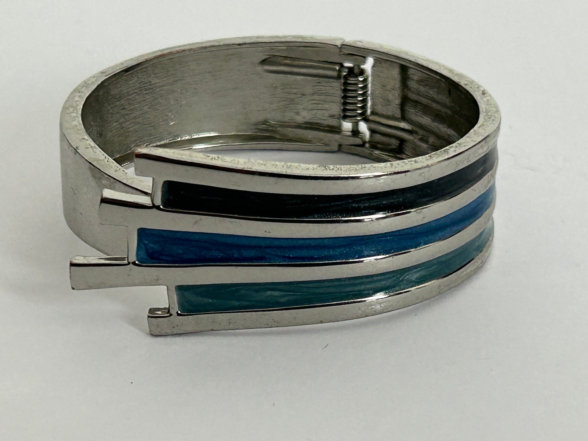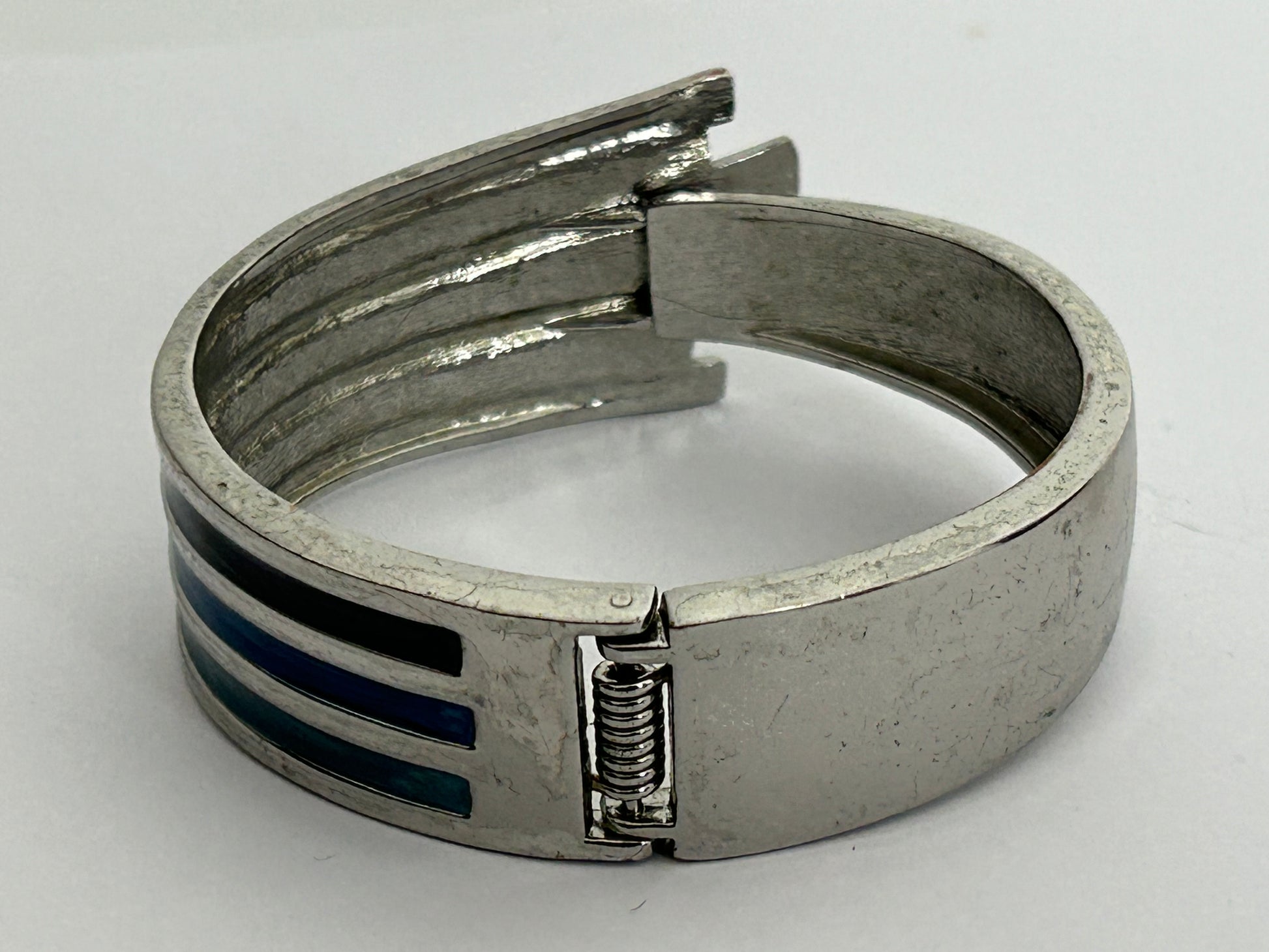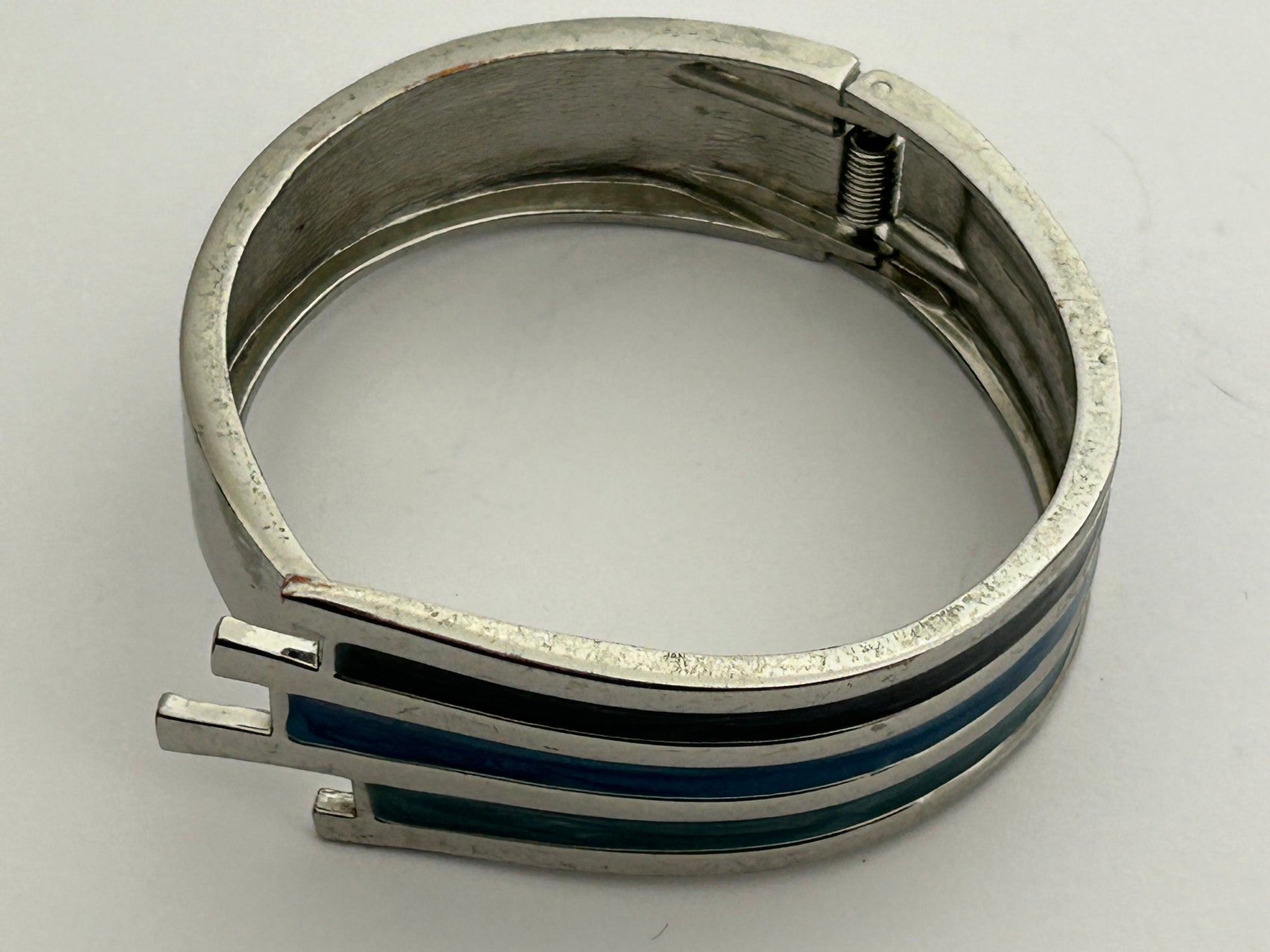 Vintage 1970s Silver Tone & Blue Enamel Modernist Hinged Clamper Bangle/Bracelet