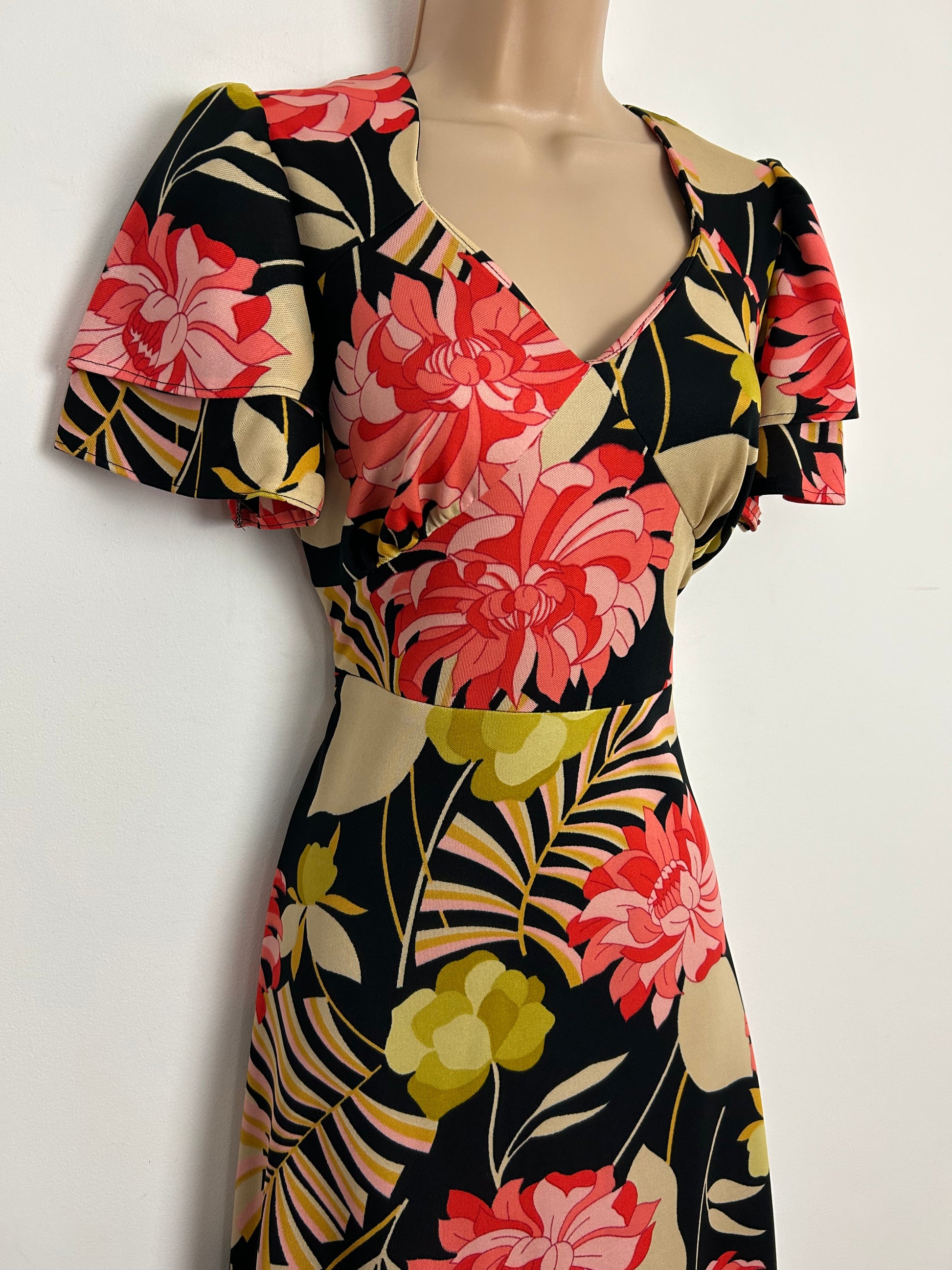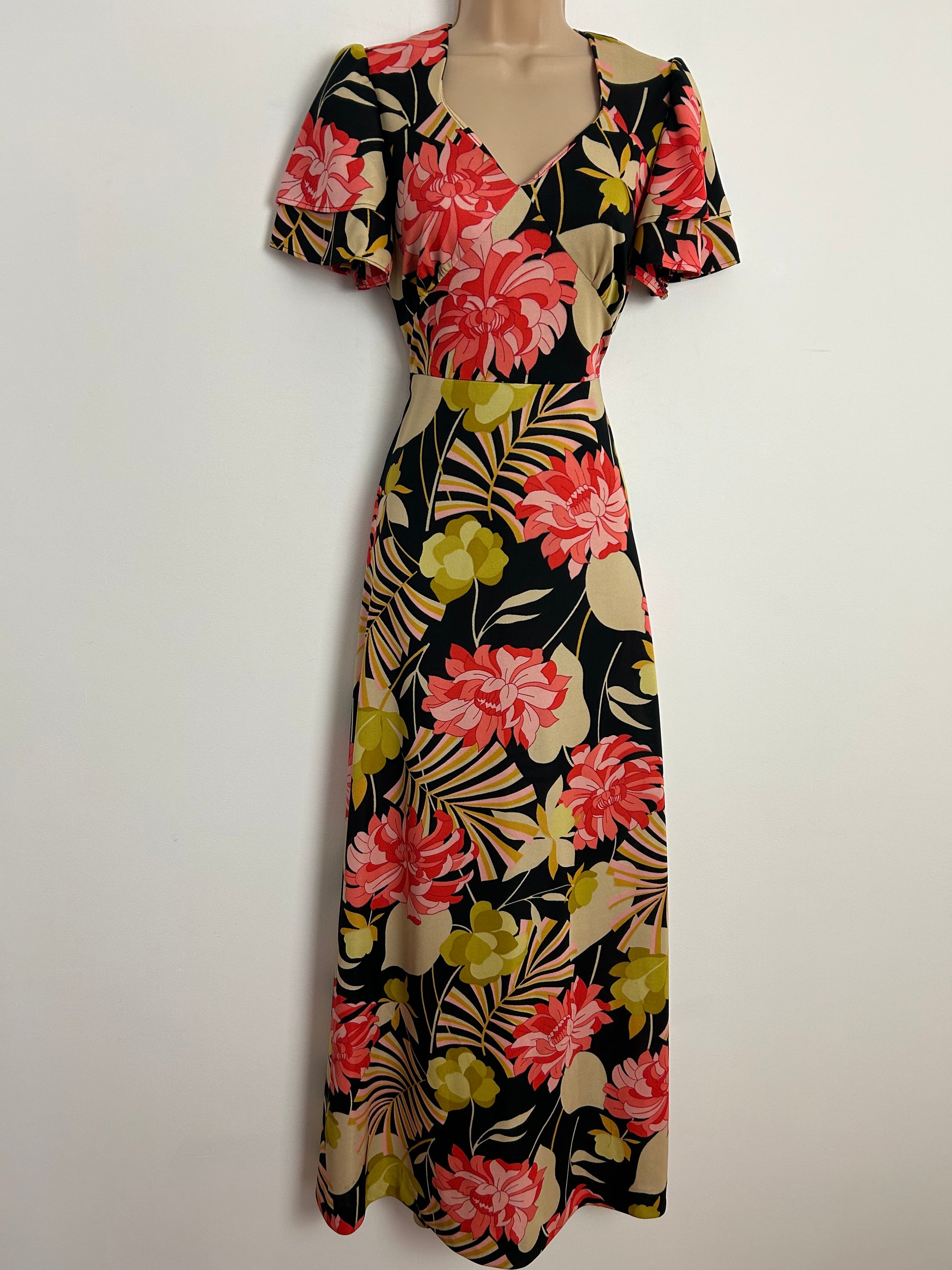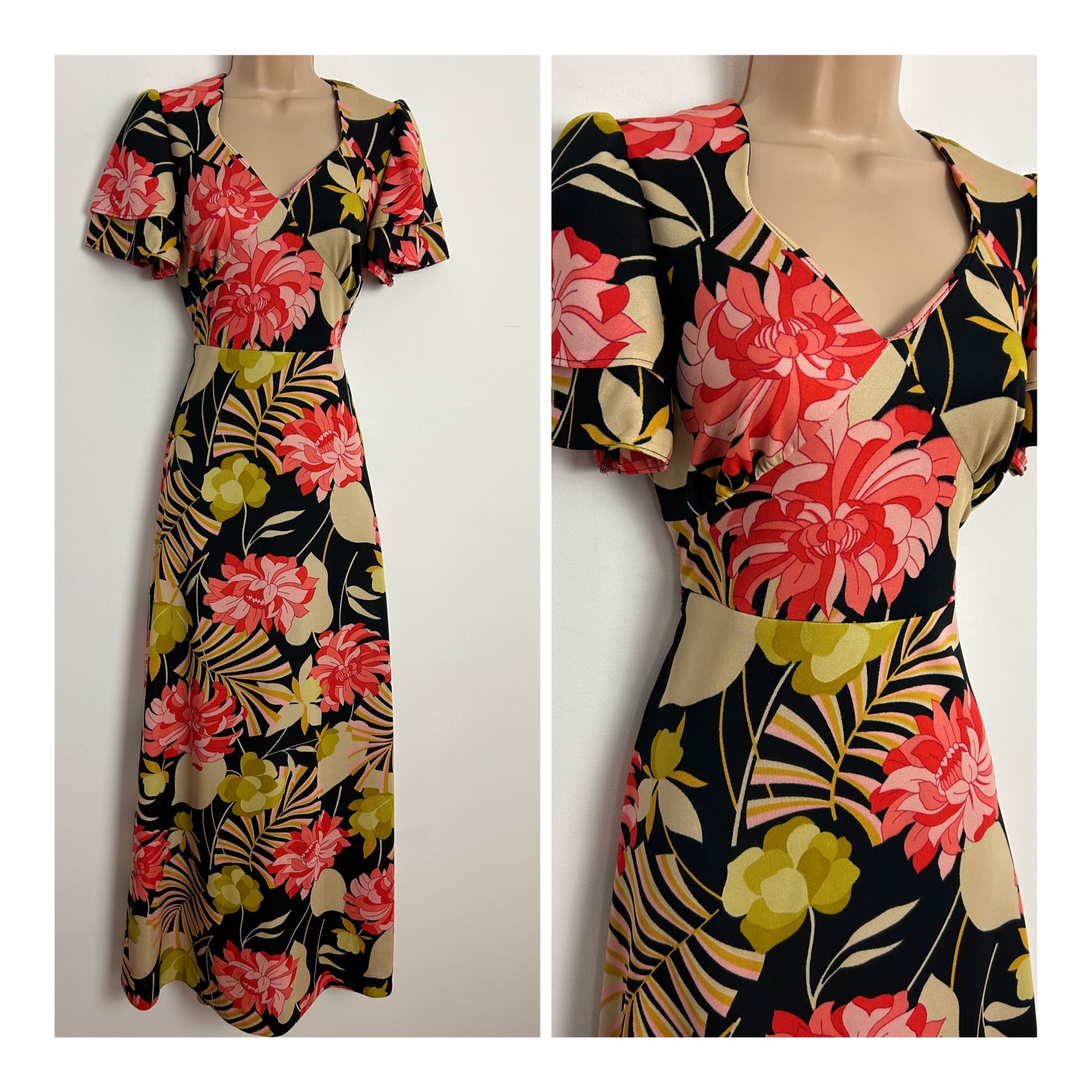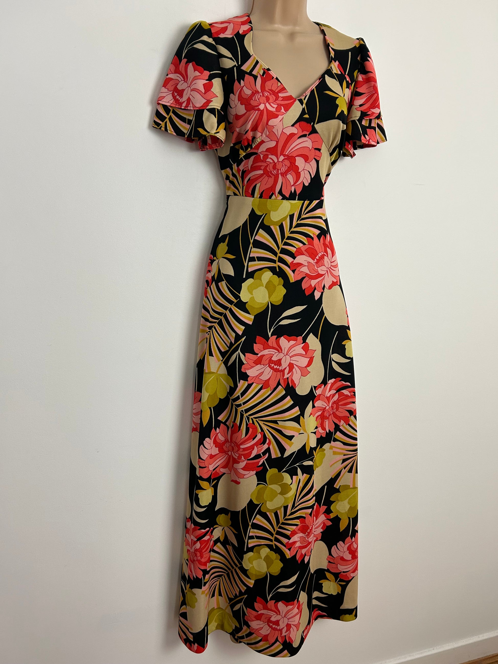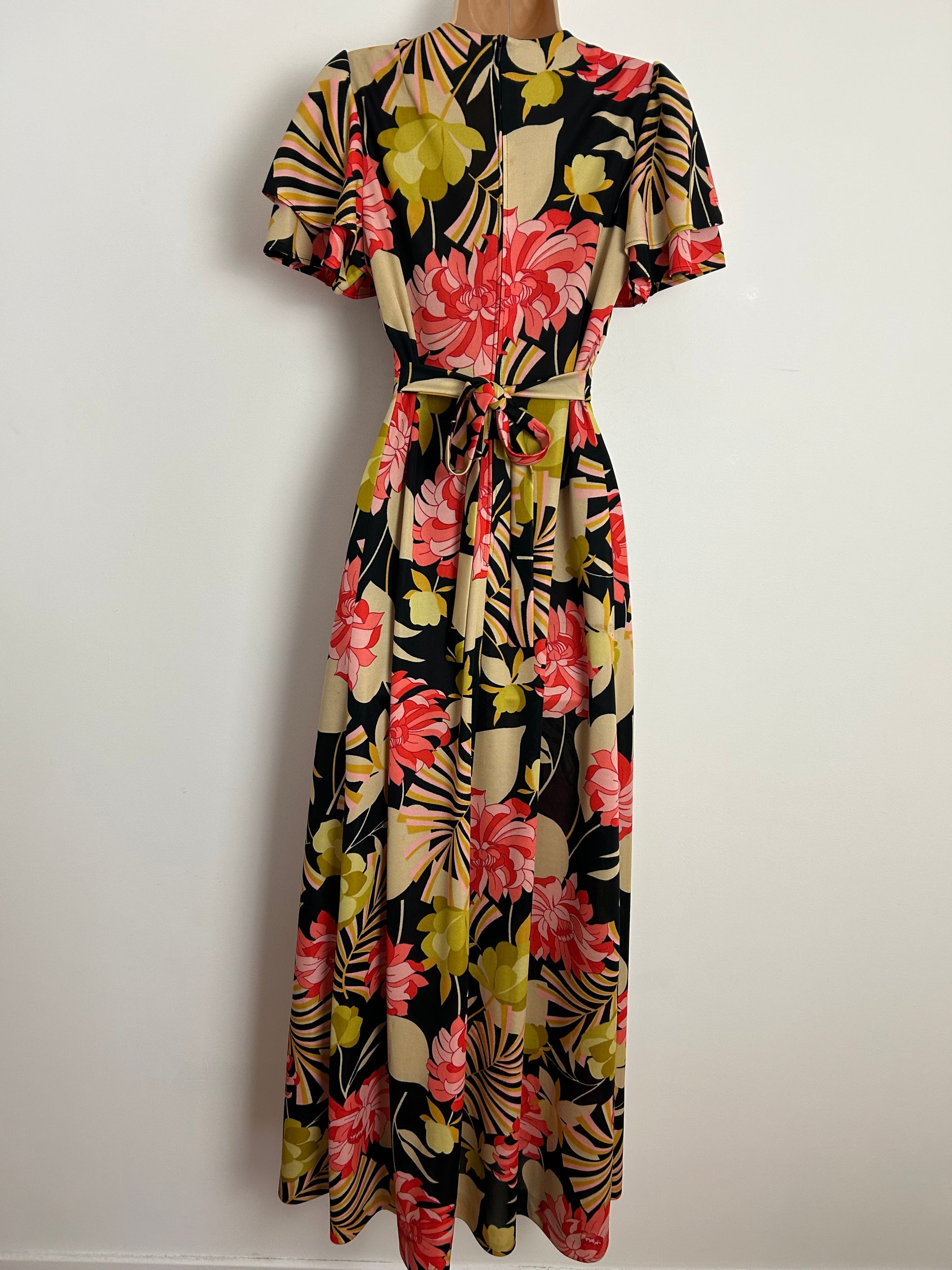 This gorgeous vintage maxi dress is made from 100% polyester in black sandy beige & coral floral print.