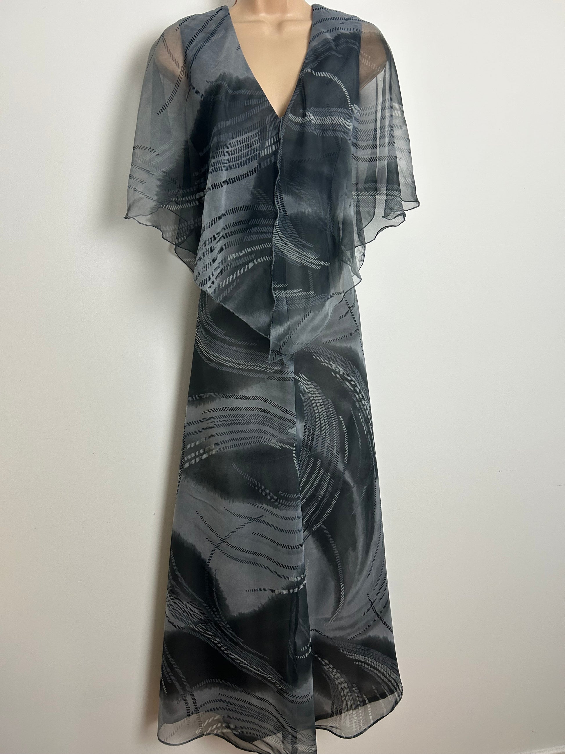 Vintage 1970s Size 10-12 Grey Tones Chiffon Polyester Cape Sleeve Boho Maxi Dress