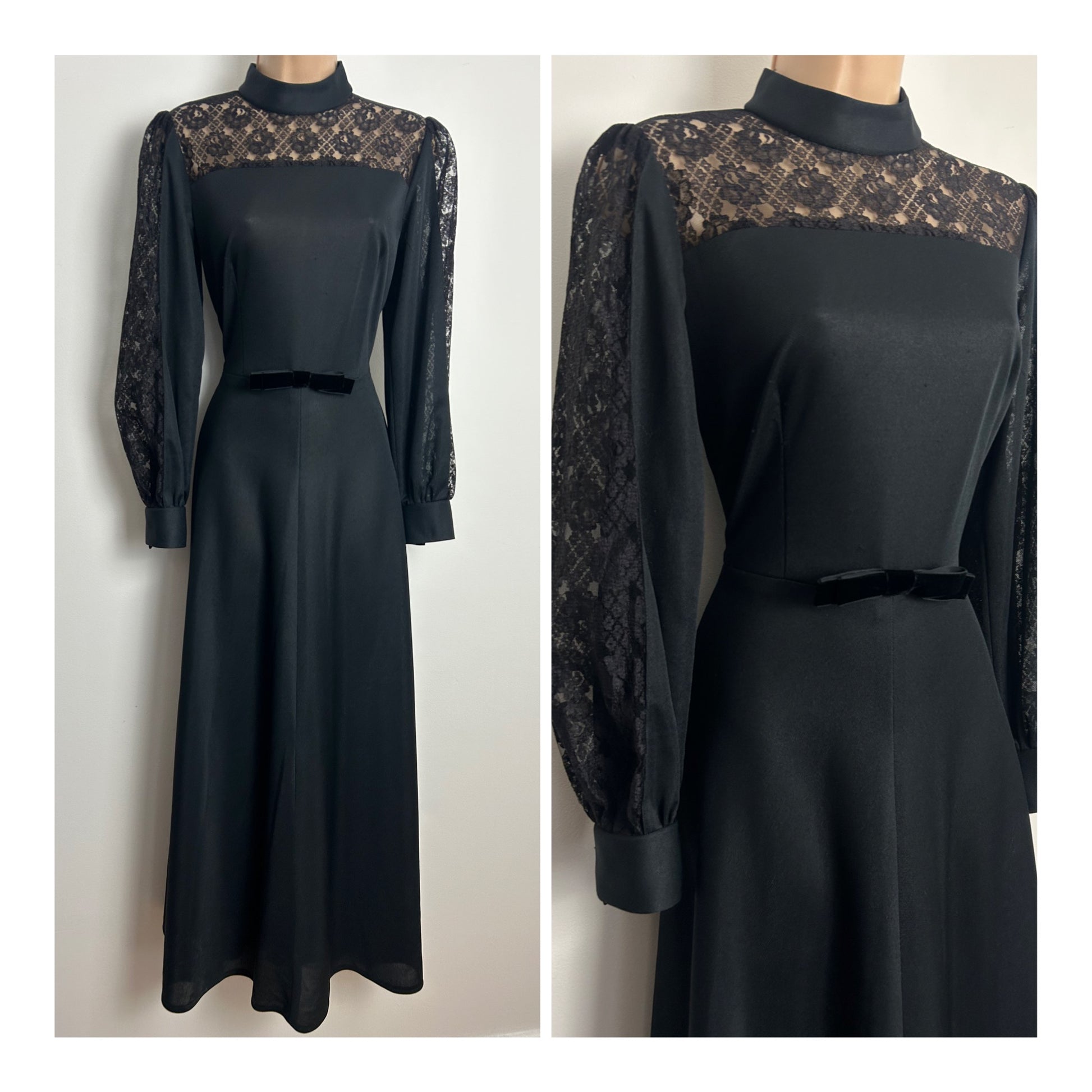 Vintage 1970s Size 10 Black Gothic Vibes Lace Illusion Neck Long Sleeve Maxi Dress