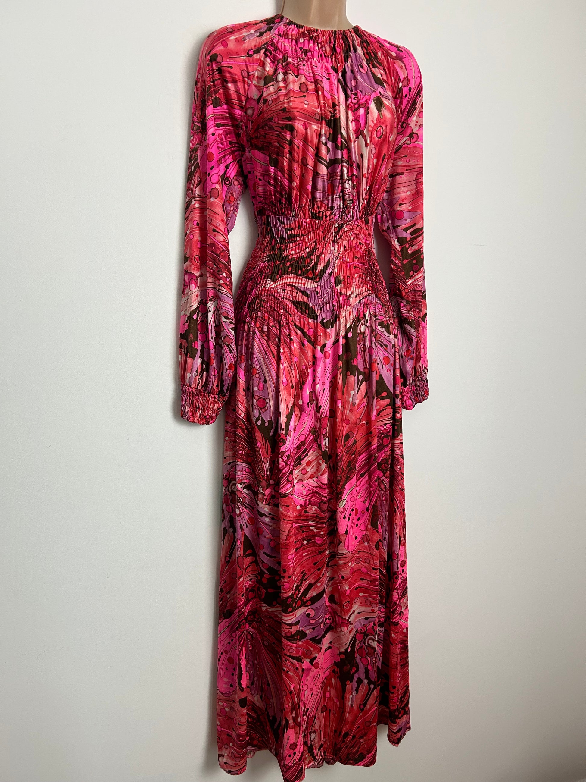 Vintage 1970s Size 10-12 Pink Abstract Psychedelic Print Long Sleeve Shirred Neck Maxi Dress