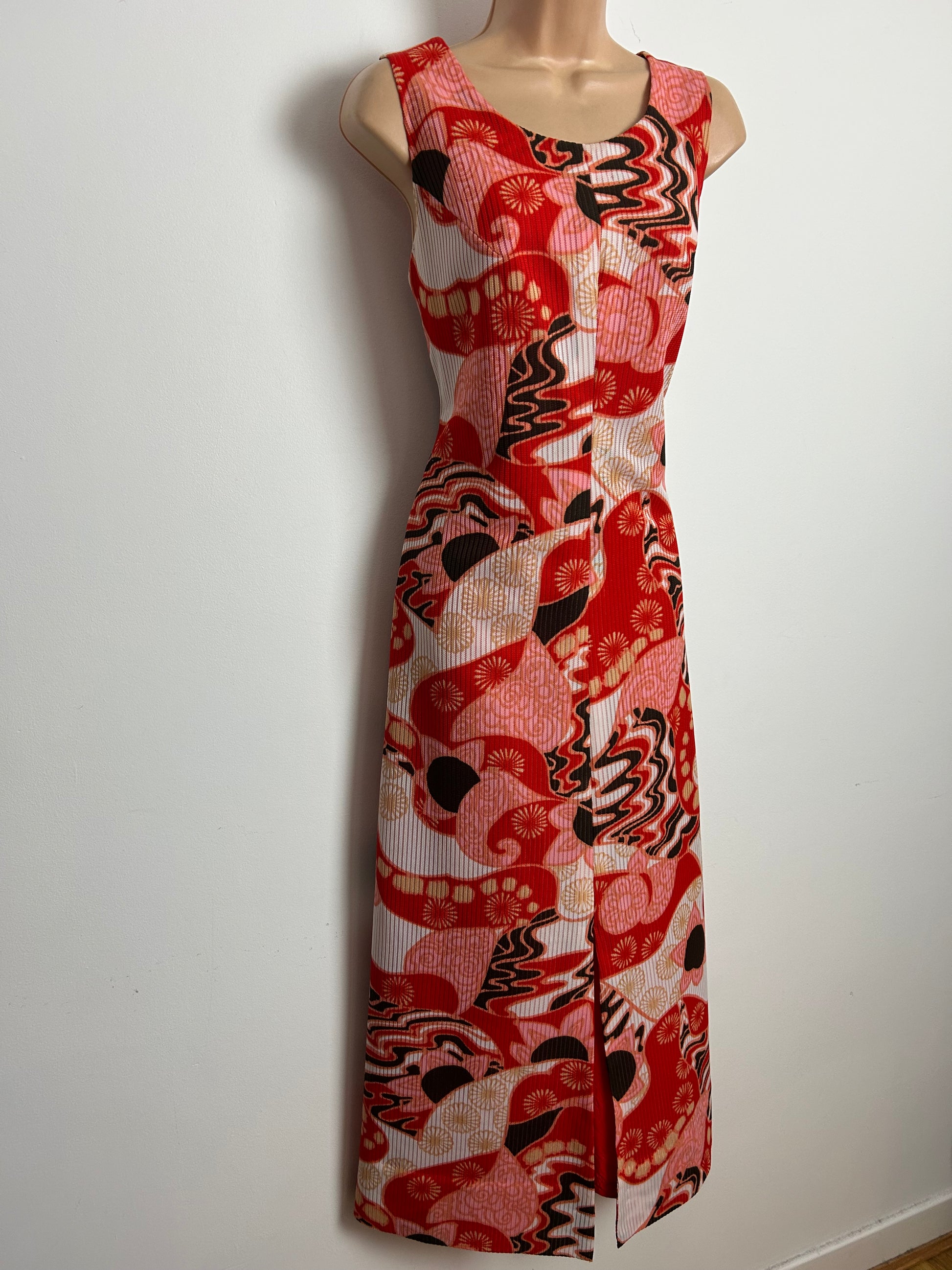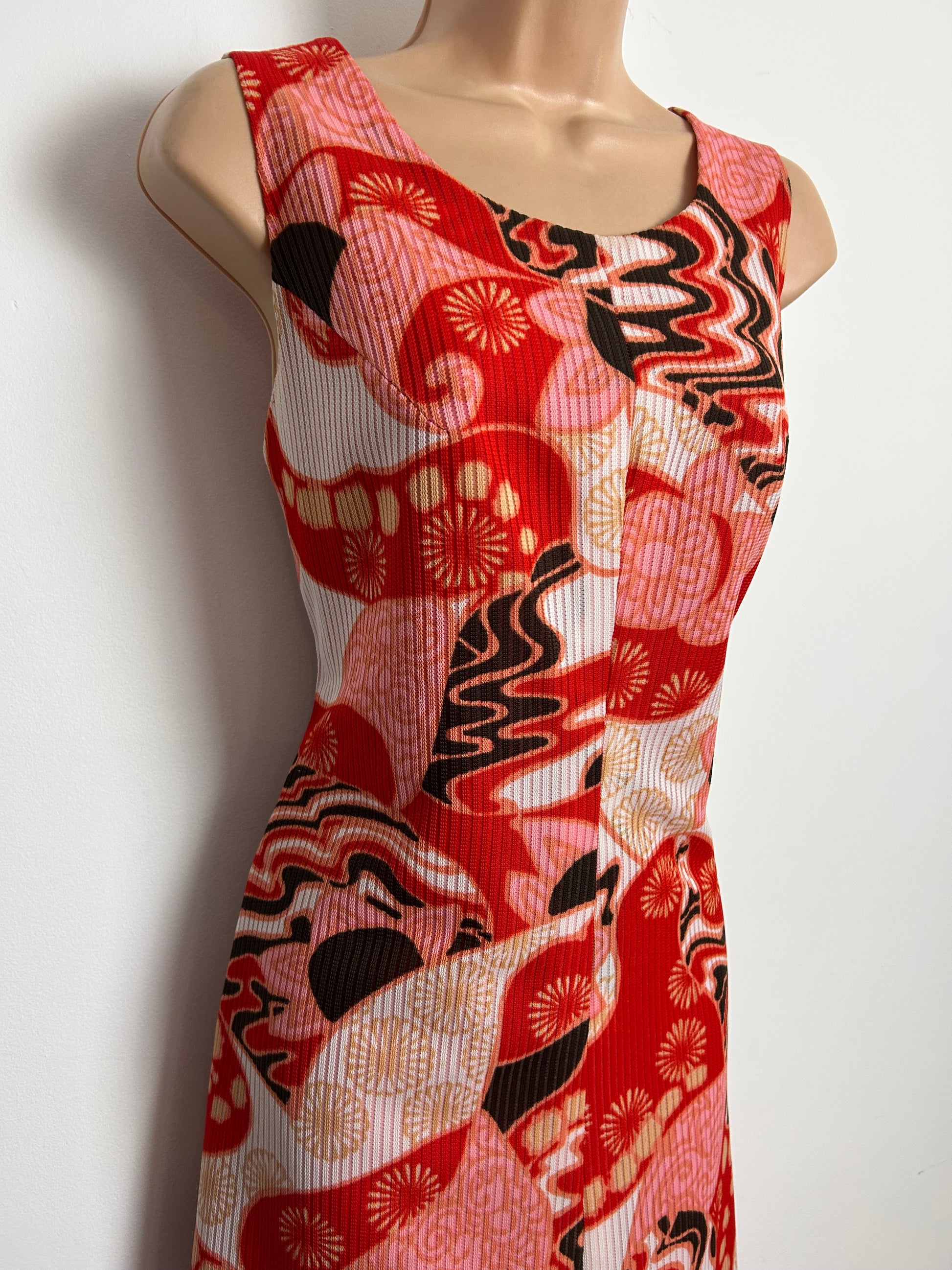 Vintage 1970s Size 10-12 Red Pink White & Black Psychedelic Abstract Print Sleeveless Maxi Dress