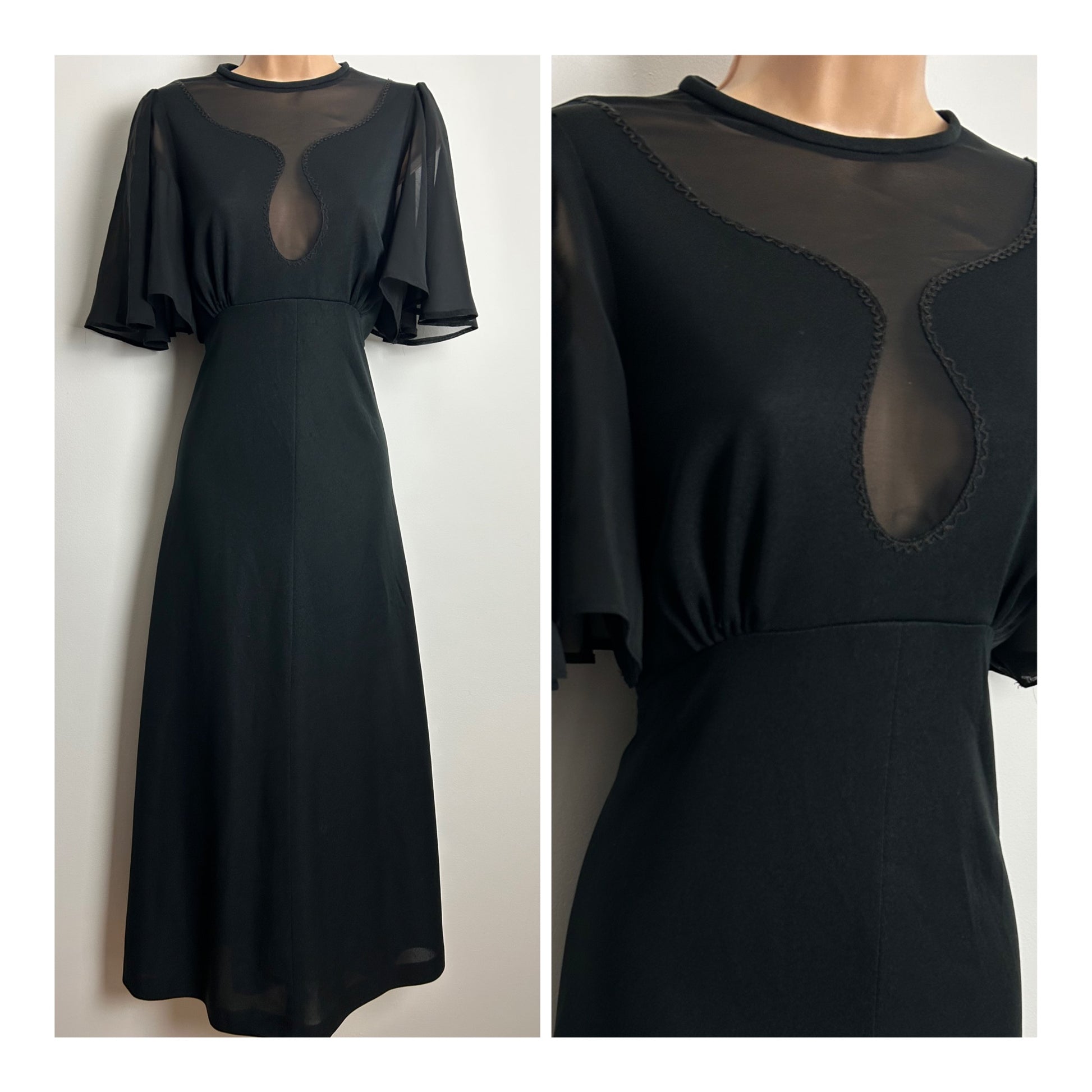 Vintage 1970s Size 12-14 Black Illusion Neck Flutter Sleeve Occasion Evening Maxi Dress