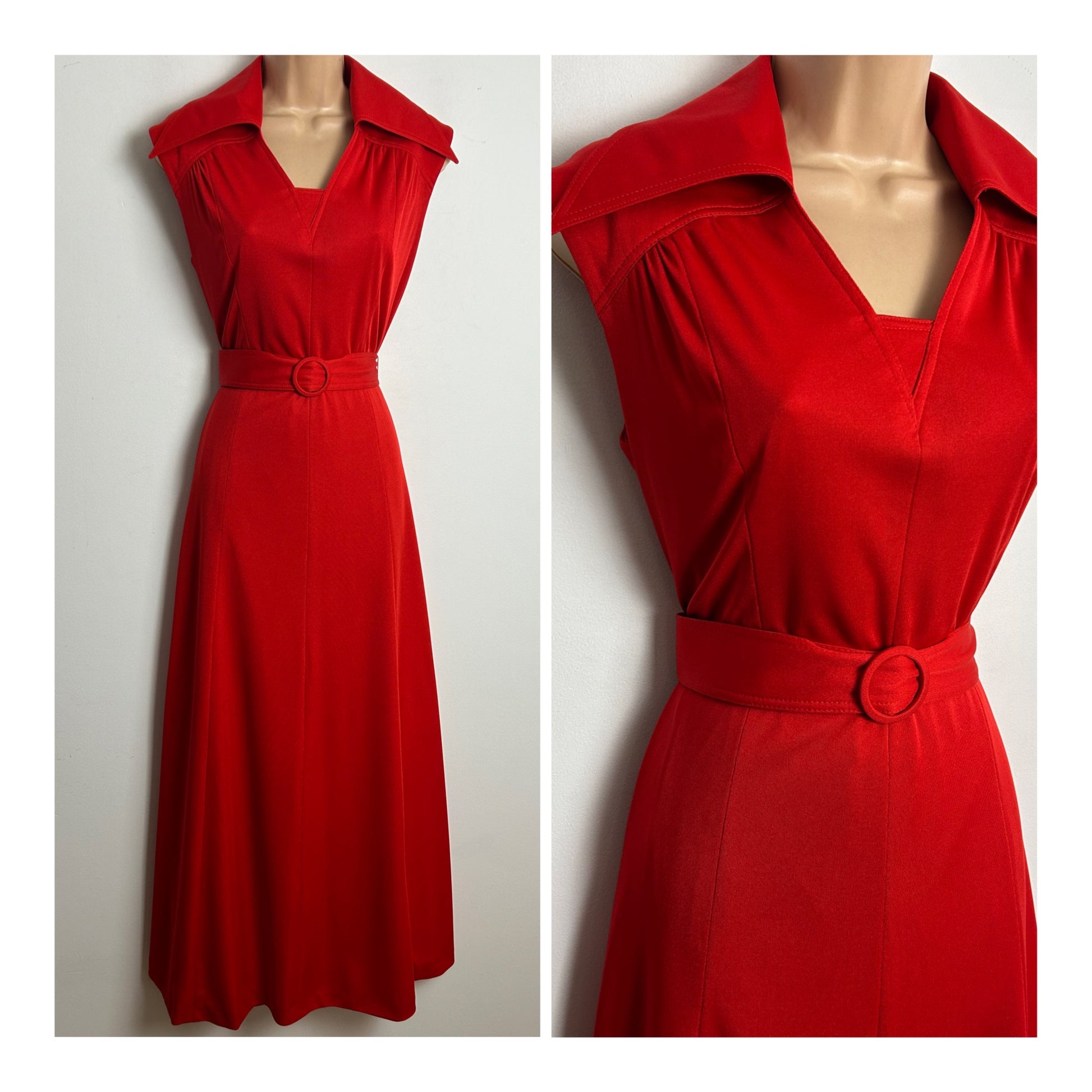 Vintage 1970s Size 12-14 Red Crimplene Sleeveless Dagger Collar Belted Maxi Dress